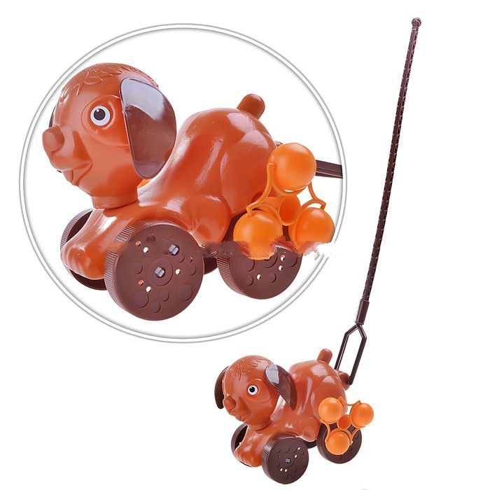 Такой добродушный игрушечный щенок вполне может стать первым домашним любимцем вашего ребенка. С ним малышу будет легче делать первые шаги и веселее гулять в любую погоду — каталка снабжена бубенчиками; которые звенят при движении; как уже знакомые погремушки. Устойчивые колеса помогают держать равновесие. При желании «поводок» можно снять; и Барбос становится домашней игрушкой без лишних мелких деталей.