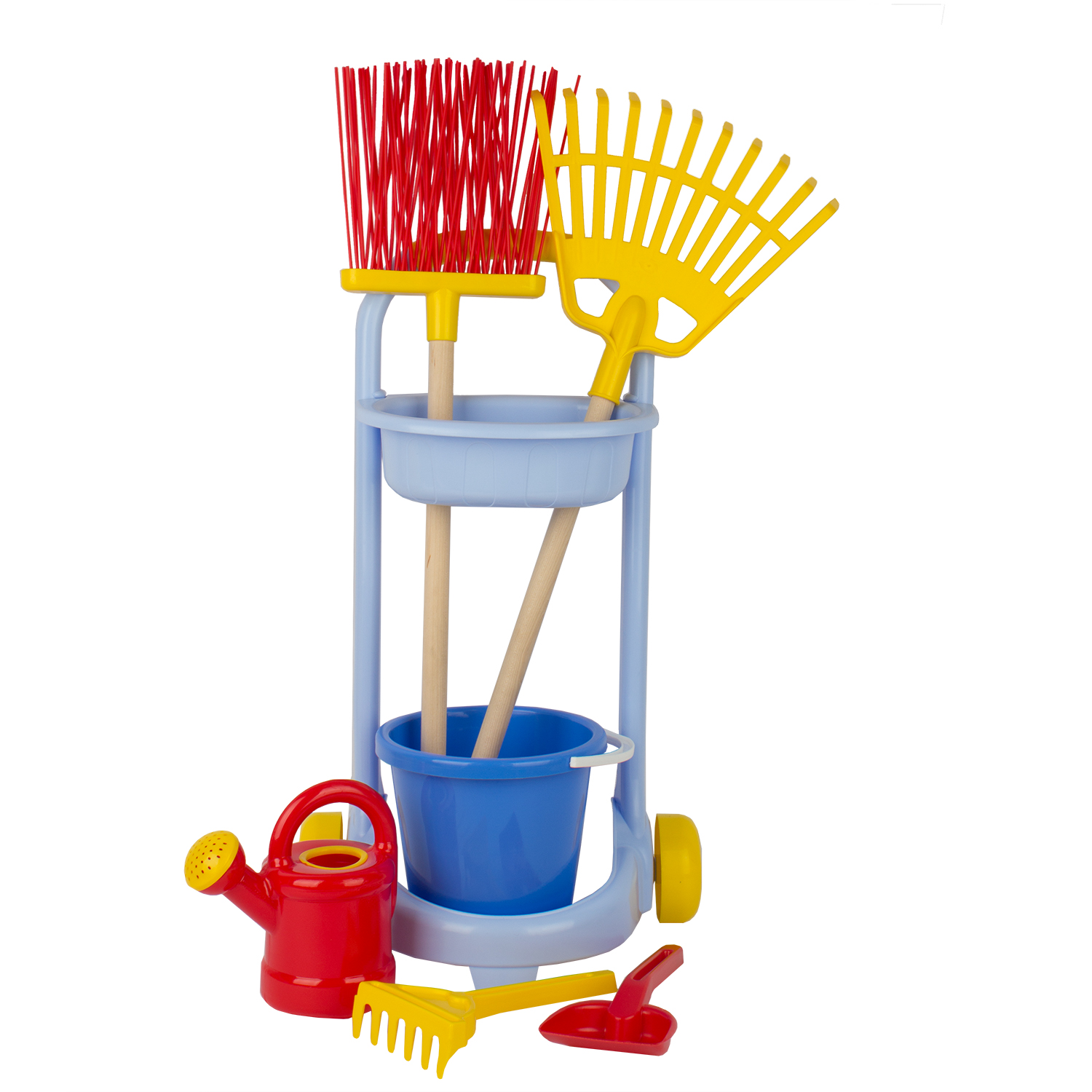состав: тележка, лейка 0,85л, ведро 1,35л, грабли веерные, метла, совок, грабельки. Игровой набор предназначен для игр на улице. Развивает социальные навыки, моторику и координацию движений. Приучает ребёнка к труду.