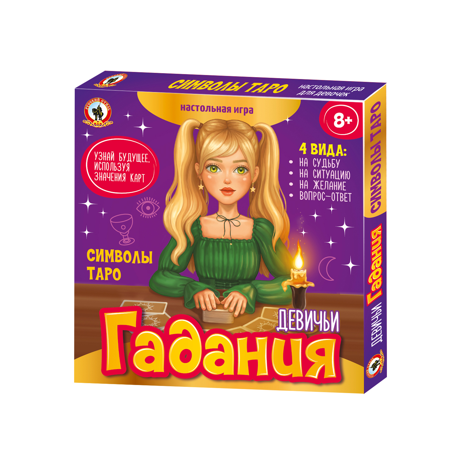 Набор «Девичьи гадания» – это увлекательное занятие для девочек. Гадание поможет создать магическую атмосферу, заглянуть в будущее, и получить ответы на свои вопросы. Никогда ещё гадать на картах таро не было так просто! Девочки смогут представить себя великими предсказательницами и заглянуть в тайны прошлого, настоящего и будущего. С помощью этого набора можно погадать на судьбу, на конкретную ситуацию, а также узнать, исполнятся ли желания, и получить ответы на загаданные вопросы. Набор «Девичьи Гадания» включает в себя двусторонние поле предсказаний, 50 карточек-предсказаний и правила.Игра предназначена для девочек в возрасте от 8 лет и старше.