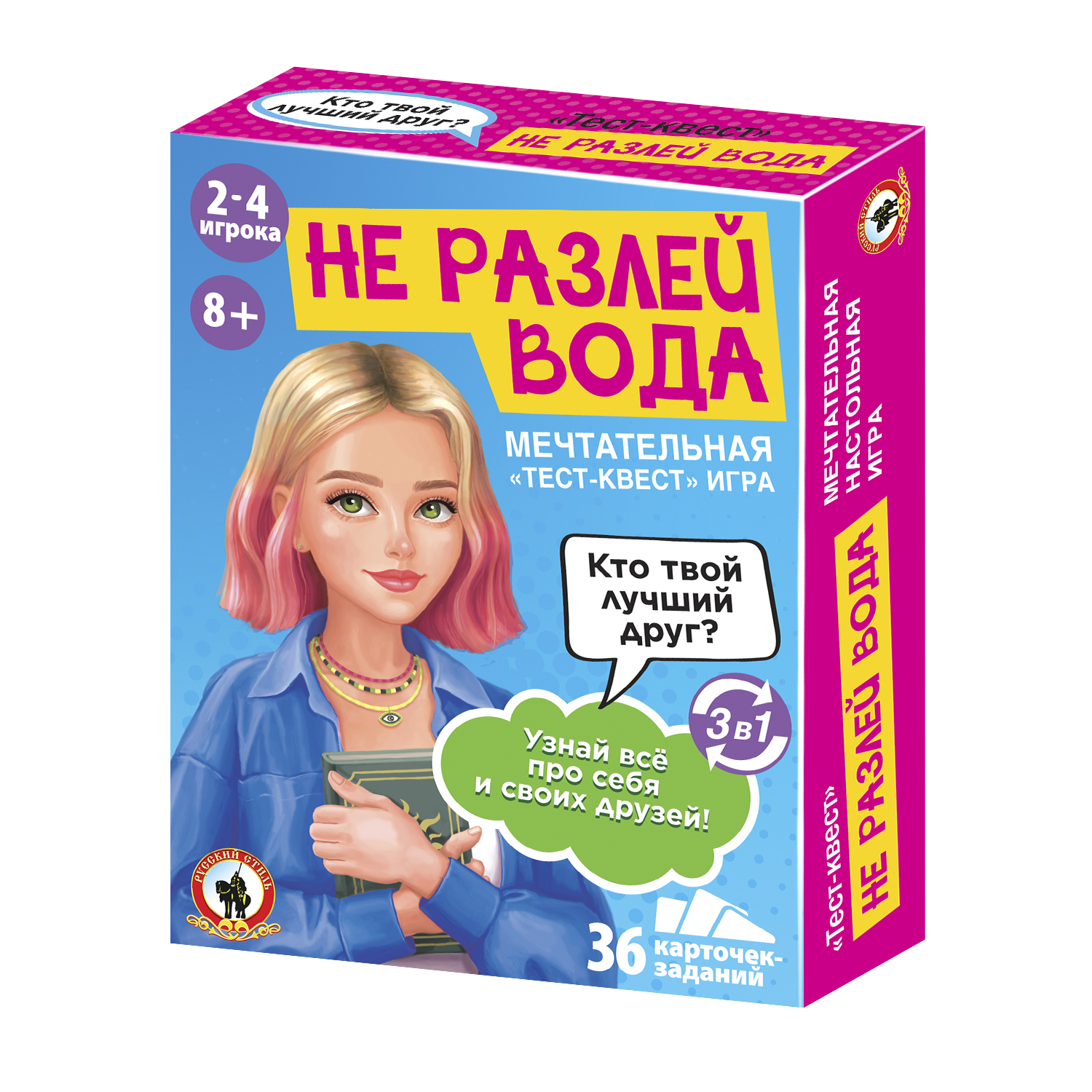 В наборе 36 карточек с уникальными тестами; 4 карточки-счетчика и жетоны. Игроки выполняют задания; выбирают ответ и передвигают жетоны на счетчиках. В конце игры игроки смогут определить; кто из игроков смог бы стать близким другом; а с кем интересы совпадают очень мало.