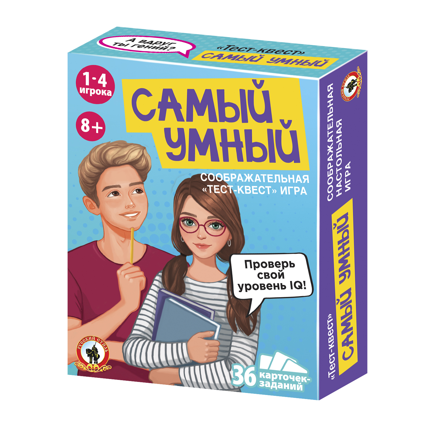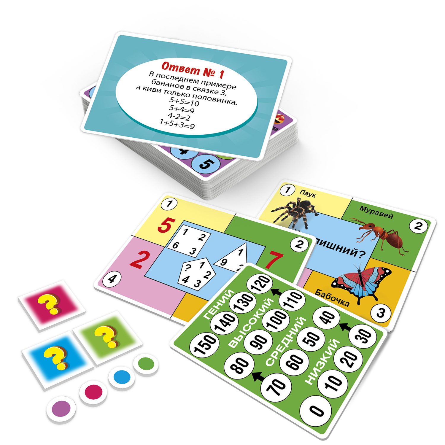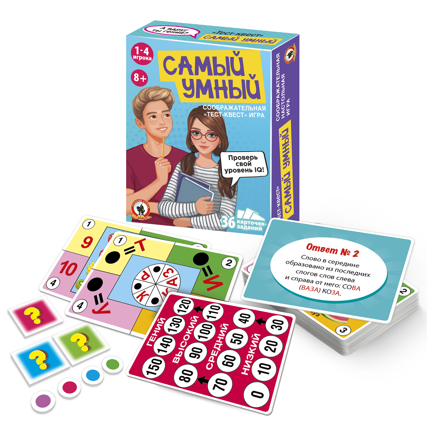 В наборе 36 карточек с интересными заданиями, 4 карточки-счетчика и жетоны. Игроки решают головоломки, отвечают на вопросы IQ -теста, выбирают ответ и передвигают жетоны на счетчиках. В конце игры игроки смогут определить, кто имеет самый высокий уровень IQ, а кому надо еще немного потренироваться.