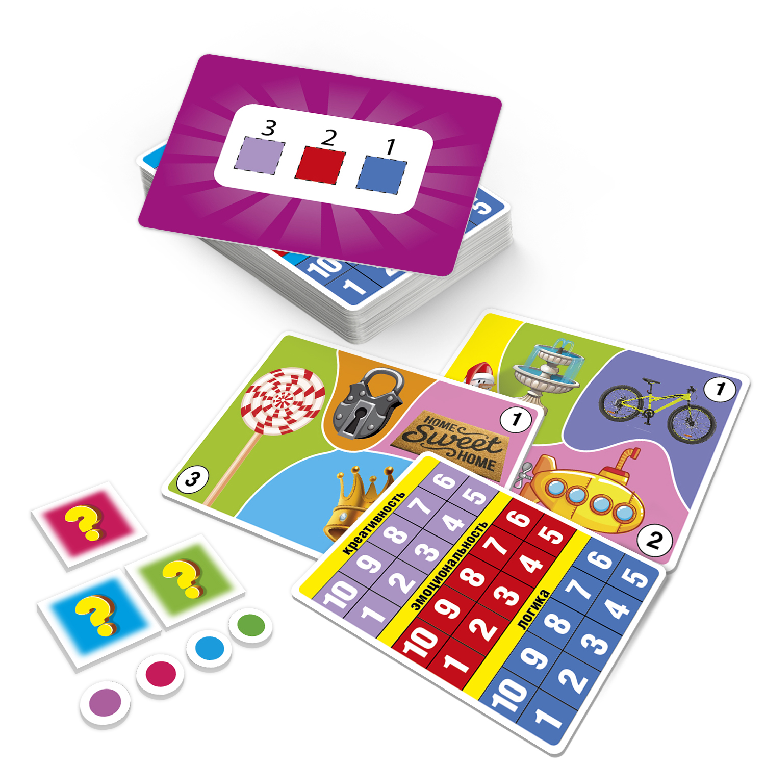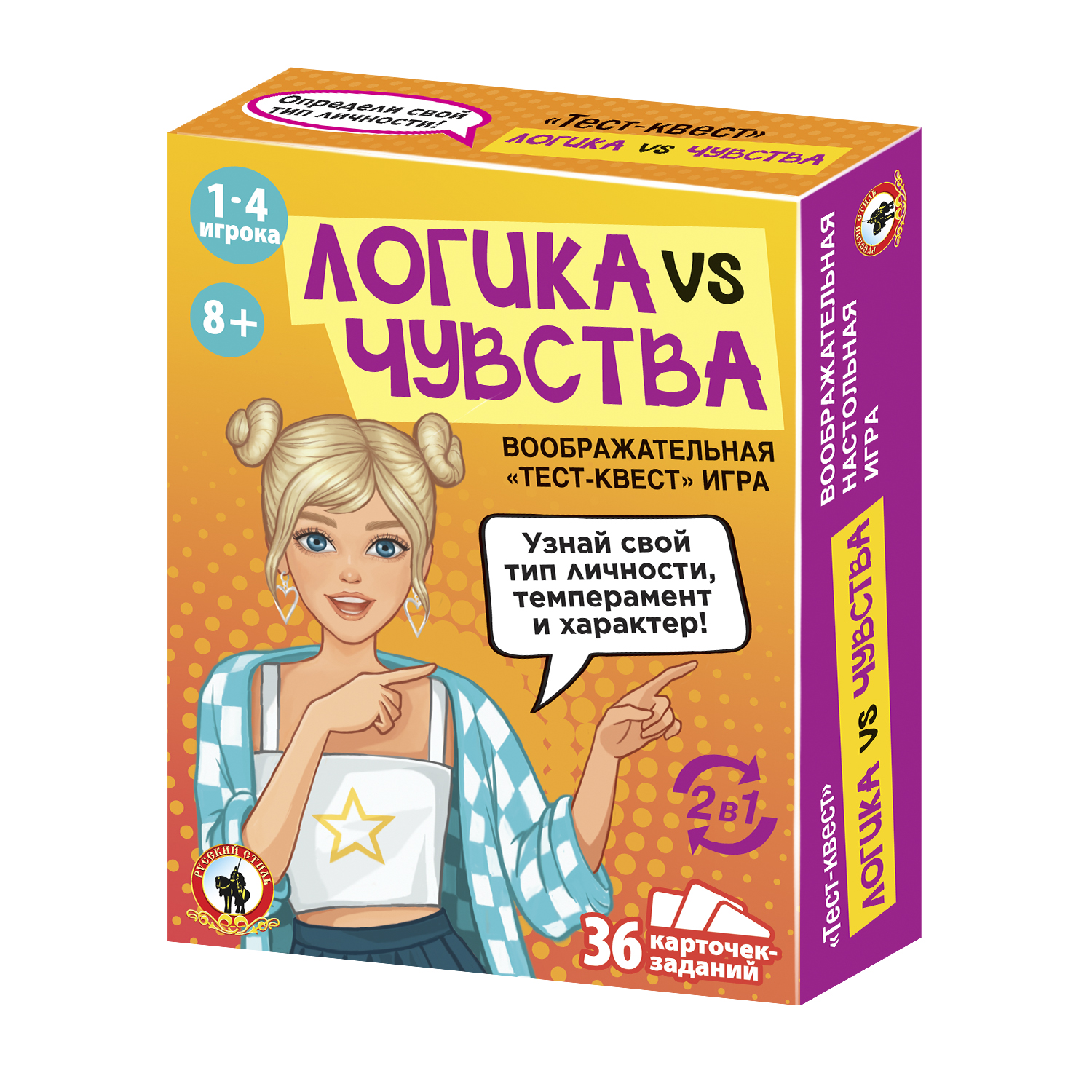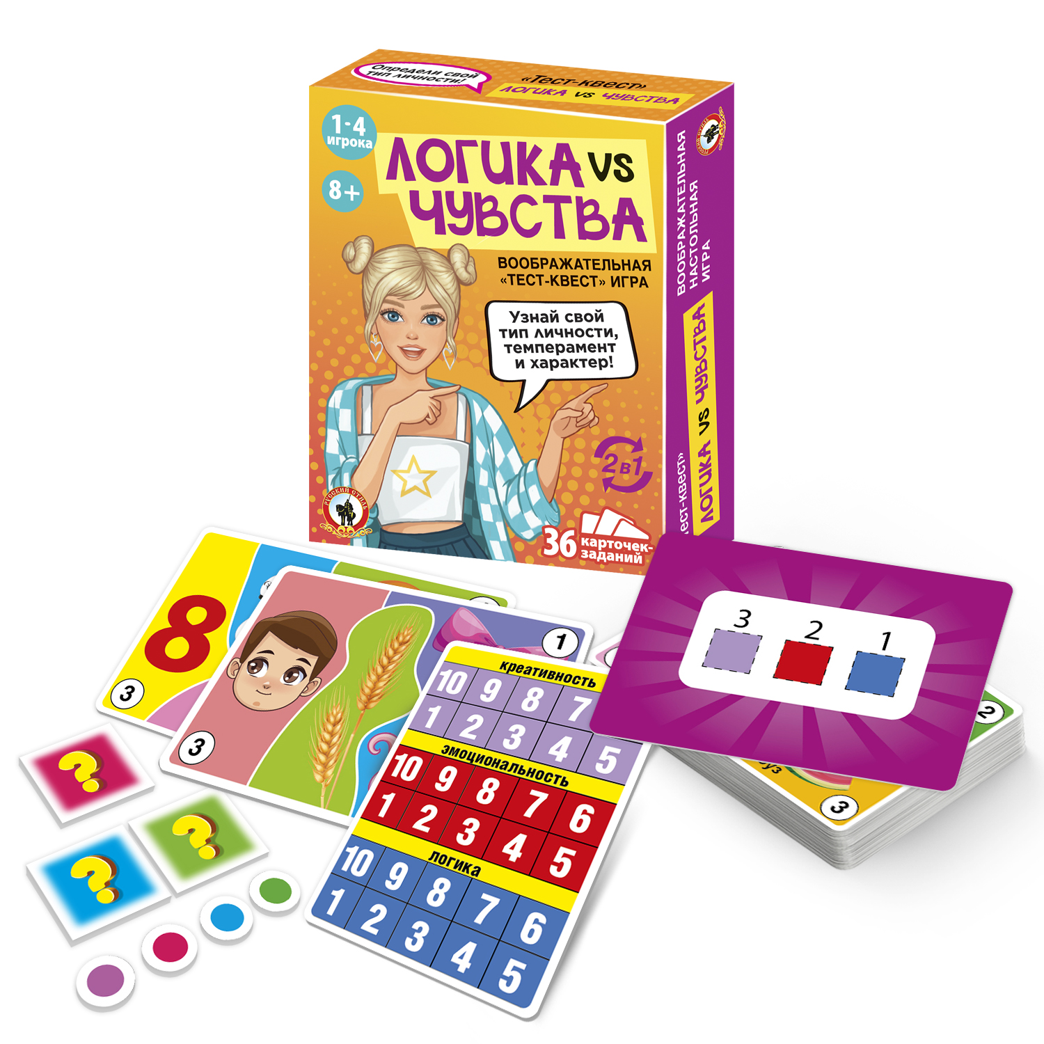 Узнаете; кто из участников игры самый логичный; кто самый эмоциональный; а кто самый креативный! Эта весёлая ассоциативная игра определит доминирующее полушарие; тип личности; темперамент и характер игроков. В наборе 36 карточек с уникальными заданиями; 4 карточки-счетчика и жетоны. Игроки выполняют задания; выбирают ответ и передвигают жетоны на счетчиках. В конце игры игроки смогут определить; кто является мастером Креатива; мастером Эмоций; мастером Креатива и Логики. Этот воображательный тест можно проходить одному игроку.