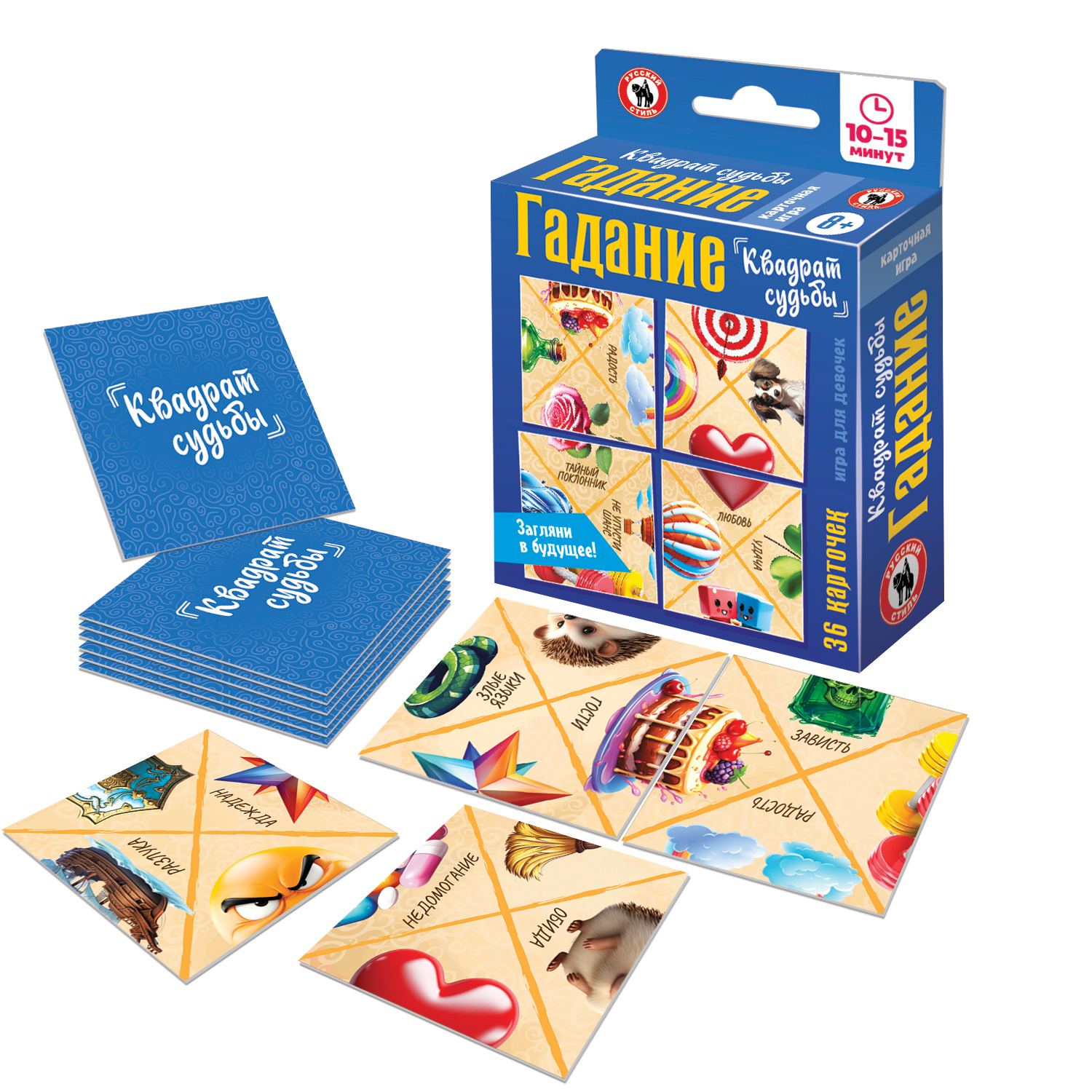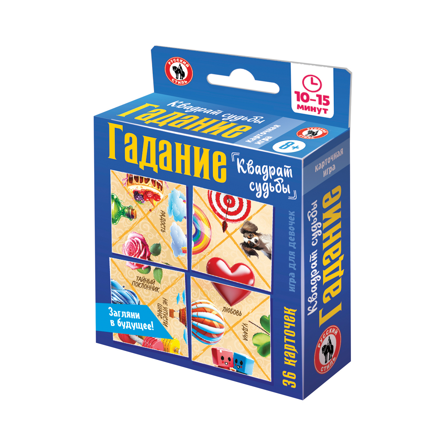 «Квадрат судьбы» – простое увлекательное гадание на каждый день, поможет заглянуть в будущее с помощью сложившихся образов, помочь разобраться в ситуации и понять, где искать свое счастье. В наборе 36 квадратных карточек, на каждой карточке изображено 4 половинки картинки. Карточки раскладываются рядами по 6 штук в 6 рядом. Цель – совместить изображение из двух половинок. В процессе раскладывания карточки можно поворачивать, так, чтобы большее количество картинок совпало. Сложившиеся изображения и надо трактовать в качестве ответа. Самые важные предсказание – те, что совпали сразу при раскладывании пасьянса. Количество игроков: 1 Возраст: 8+ Состав игры: карточки – 36 шт., правила Материал: картон, бумага