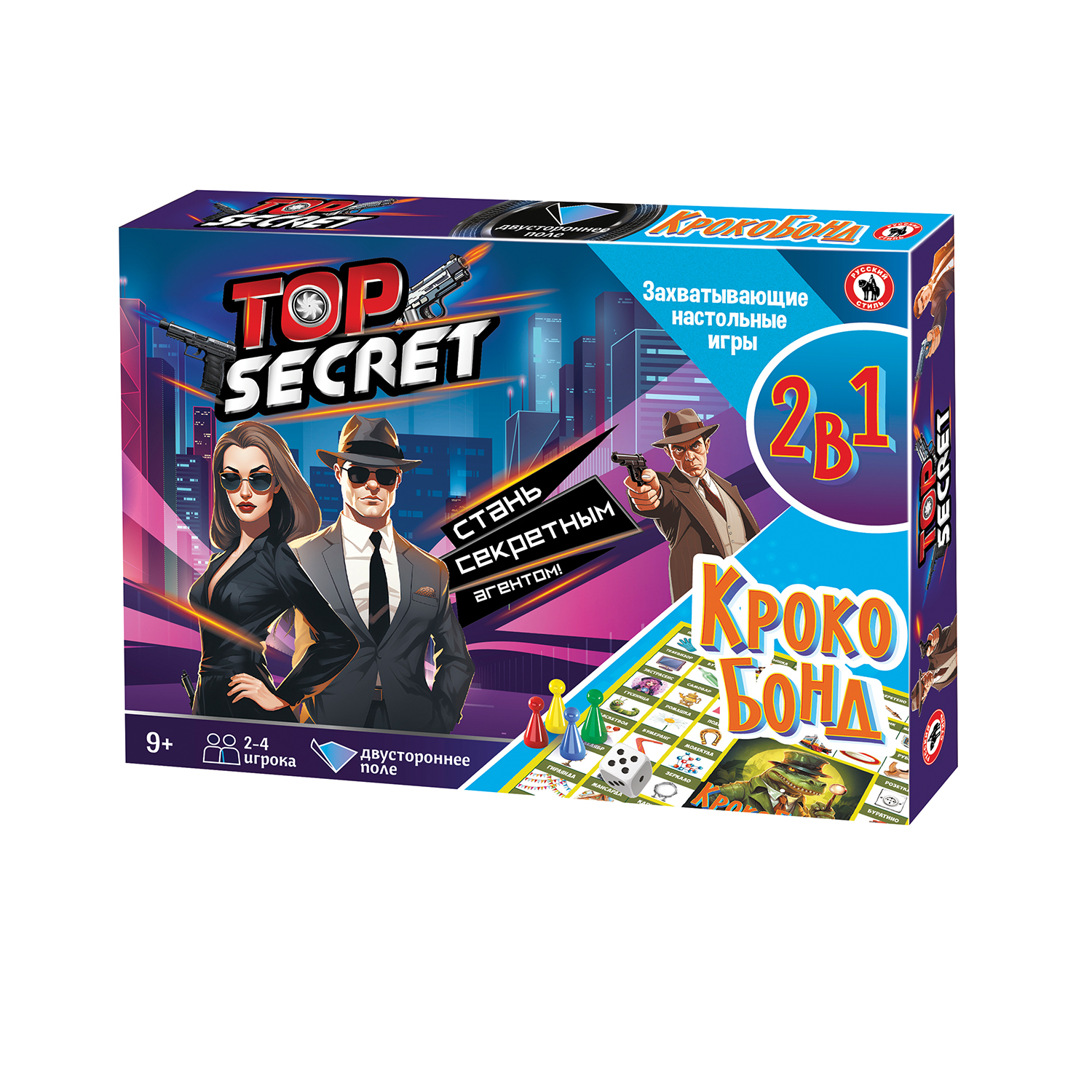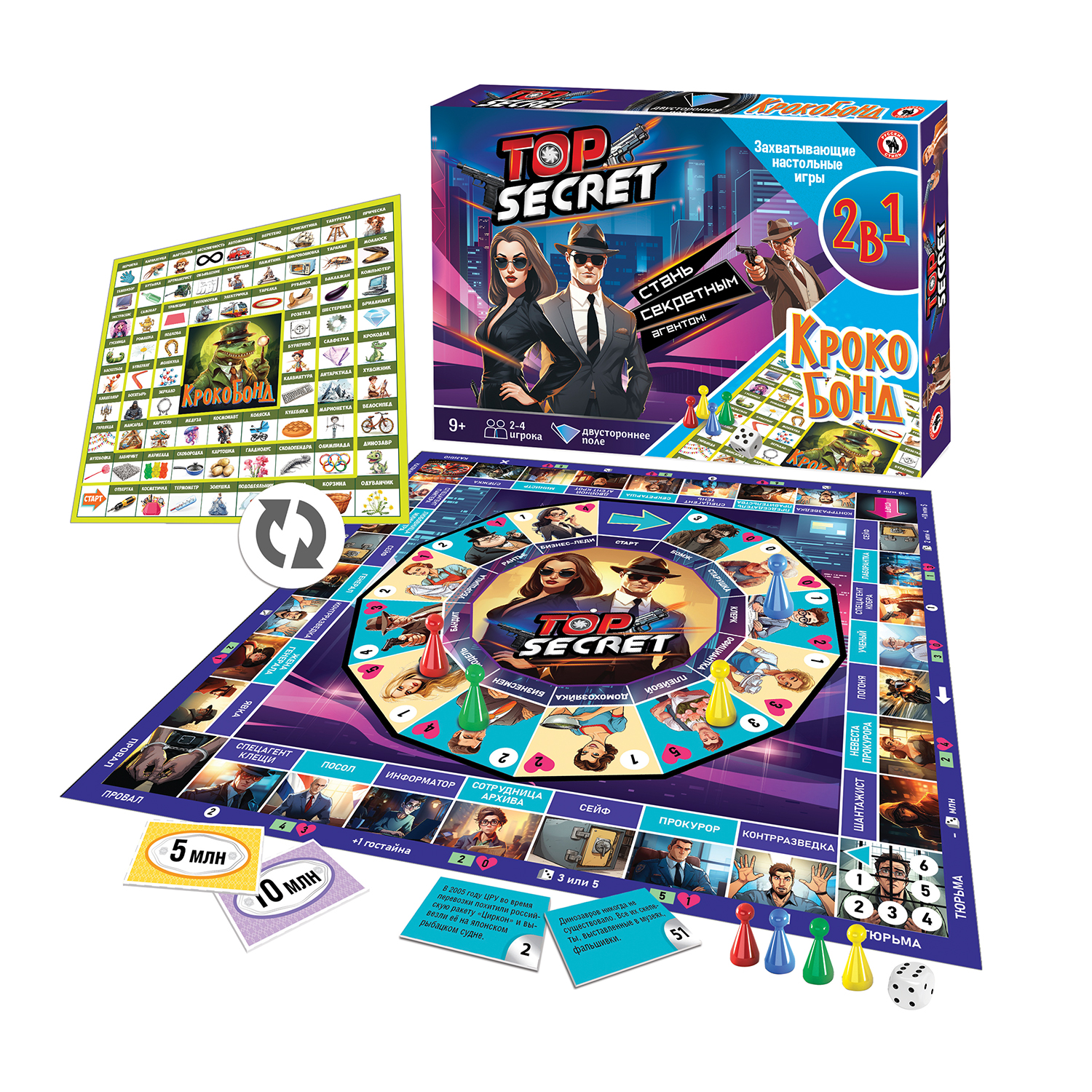 Серия игр 2в1 включает в себя две увлекательные настольные игры для веселой компании. «Top secret» – игра для любителей шпионов, игрокам предстоит менять свою внешность, как перчатки и создавать легенды, отвечать на каверзные вопросы, искать источники информации, очаровывать, подкупай, сражаться с вражескими шпионами, выведывать государственные тайны, и стать суперагентом. Вторая игра – «Крокобонд» – необычный шпионский «Крокодил». Игроки должны находить слова внутри других слов и показывать их друг другу по правилам игры в «Крокодил». Эти игры с простыми правилами помогут участникам весело провести время, лучше узнать друг друга и крепче подружиться и повеселиться. Количество игроков: 2-4 Возраст: 9+ Состав игры: игровое поле, кубик, фишки – 8 шт., карточки – 80 шт., правила. Материал: картон, бумага, пластмасса