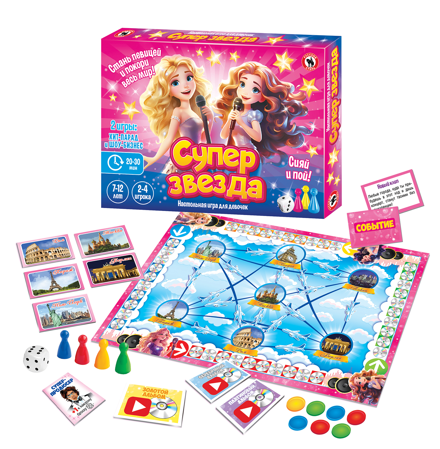 Мечтаешь стать настоящей суперзвездой, летать по миру с концертами и быть кумиром миллионов? Тогда скорее отправляйся в кругосветное турне со своим новым альбомом. Эта увлекательная игра распахнёт перед игроками двери в сверкающий мир шоу-бизнеса и вознесет на вершину успеха и популярности. Игрокам предстоит выпускать новые вокальные альбомы, давать концерты в разных уголках земного шара, сотрудничать с продюсером и побороться за самый высокий рейтинг, выпустив платиновый альбом. Количество игроков: 2-4 Возраст: 7-12 лет Состав игры: игровое поле, кубик, фишки – 4 шт., жетоны – 32 шт., карточки – 35 шт., правила игры Материал: картон, бумага, пластмасса