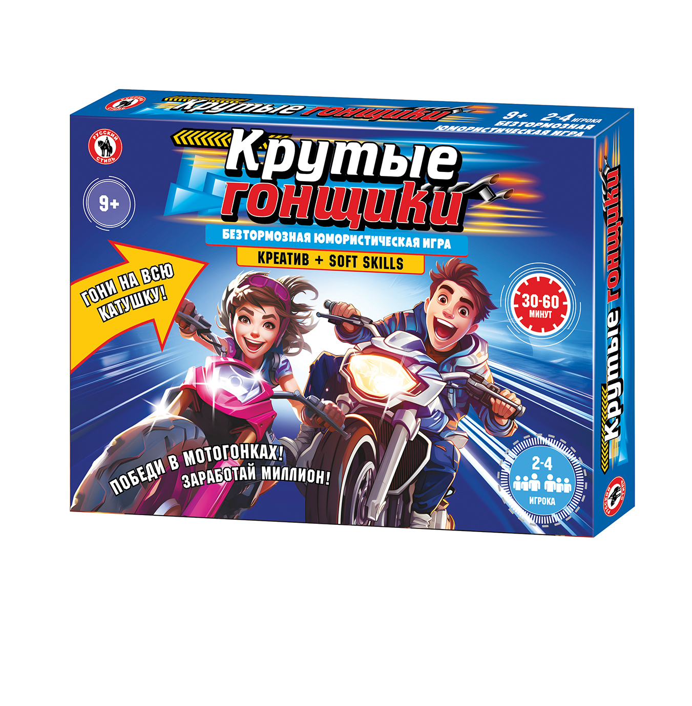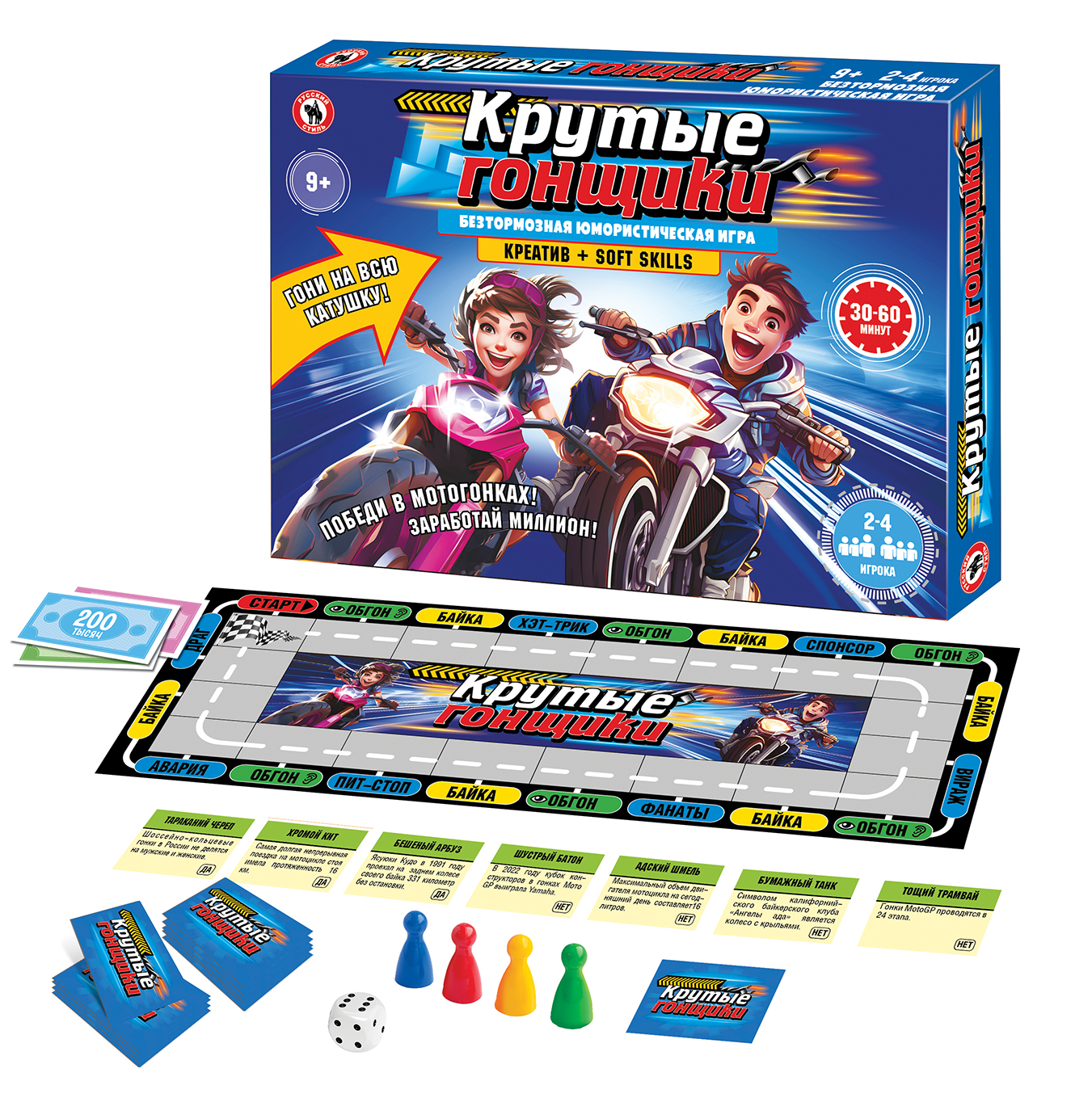 Эта игра для тех, кто без ума от бешеной скорости и крутых байков! Игроки станут крутыми гонщиками, а самый быстрый победит в гонках и заработает миллион! Участвуя в этой юмористической коммуникативной игре, игрокам предстоит не только мчаться по полной опасностей гоночной трассе, но и попутно травить байки и обгонять соперников с очень смешными прозвищами. А помимо этого, в процессе игры игроки узнают много интересных фактов о байках и мотоциклах, гонках и великих гонщиках. Количество игроков: 2-4 Возраст: 9+ Состав игры: игровое поле, кубик, фишки – 4 шт., карточки – 100 шт., жетоны скорости – 40 шт., деньги – 40 купюр, правила игры. Материал: картон, бумага, пластмасса