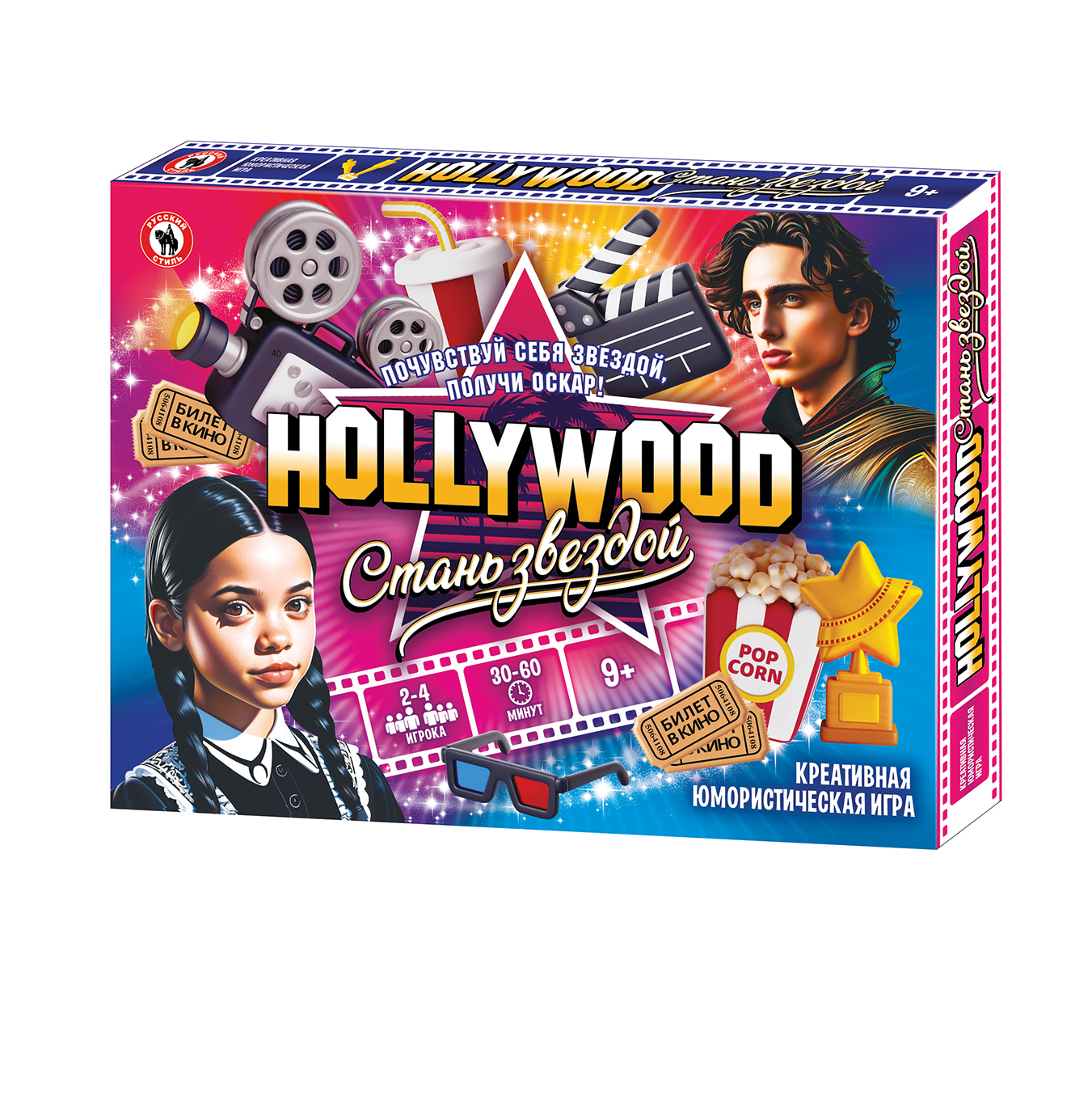 В этой увлекательной коммуникативной игре игрокам предстоит отправиться в Голливуд, где они будут участвовать в кастингах, кинопробах, сниматься в рекламе и кинофильмах. Игроки смогут развить свой актерский талант, завоевать славу и популярность, а также стать самой знаменитой и высокооплачиваемой кинозвездой, получив «Оскар»! Участвуя в этой увлекательной игре, дети и взрослые смогут продемонстрировать артистизм и умение импровизировать. Игроки получают карточки с заданиями, успешно выполняя их, продвигают свою фишку по клеткам на пути к Оскару. Количество игроков: 2-4 Возраст: 9+ Состав игры: игровое поле, кубик, фишки – 8 шт., карточки рекламы – 50 шт., карточки кинопроб – 50 шт., жетоны удачи – 40 шт., деньги – 40 купюр, правила игры. Материал: картон, бумага, пластмасса