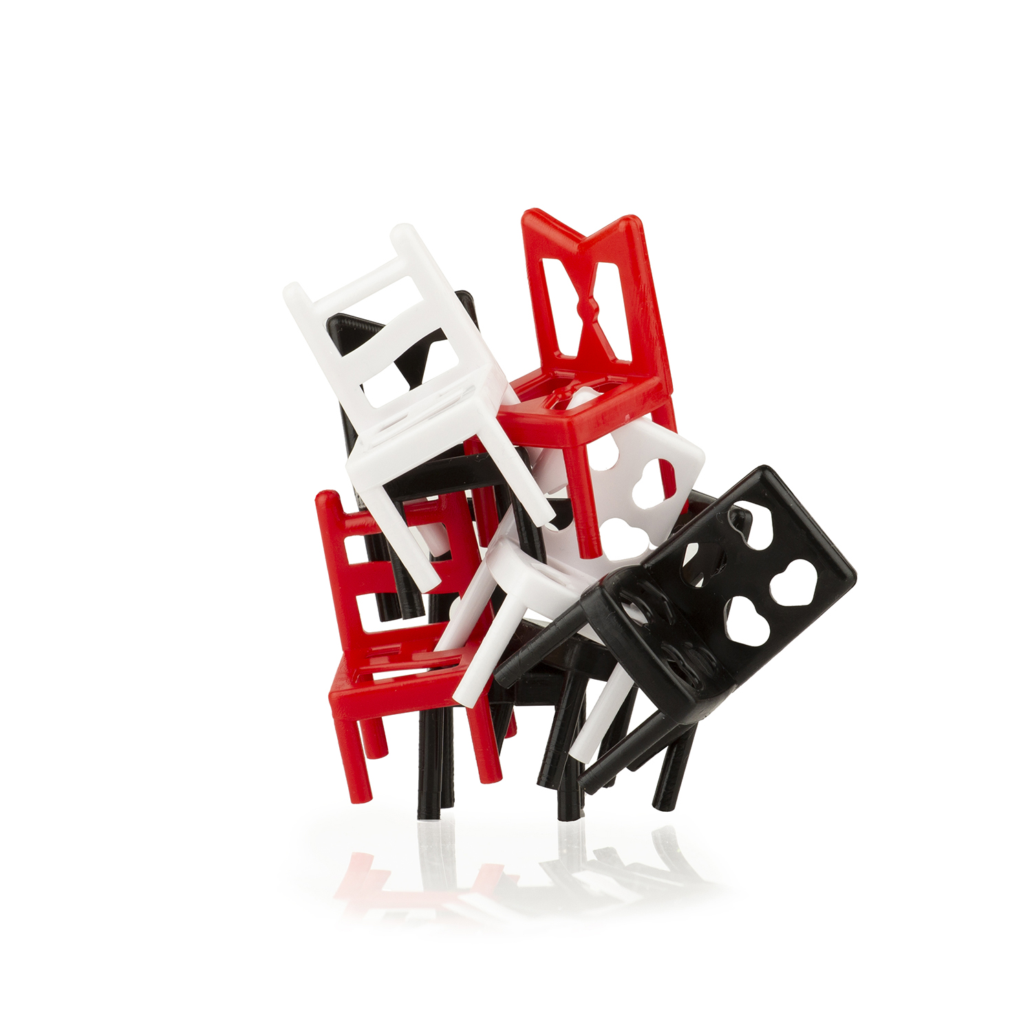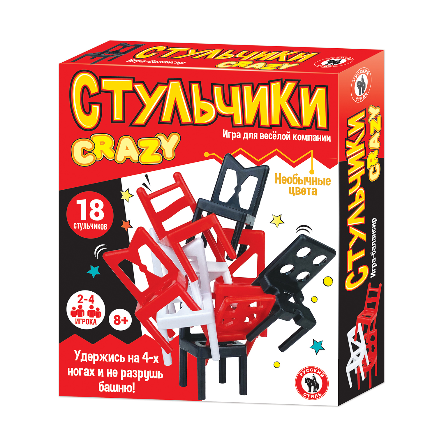 Стульчики – очень популярная игра на ловкость! Игрокам необходимо построить башню из стульчиков таким образом, чтобы конструкция не упала. Цель игры – первым избавиться от своих стульев. Стульчики можно соединять друг с другом любой стороной: ставить друг на друга, боком, вверх ногами и т.д. Если в ход игрока конструкция из стульчиков развалилась – игрок забирает себе все упавшие стульчики. Цветовая гамма стульчиков из этого набора очень необычная, поднимет праздничное настроение и понравится детям, подросткам и взрослым. Количество игроков: 2-4 Возраст: 8+ Состав игры: 18 стульчиков Материал: пластмасса