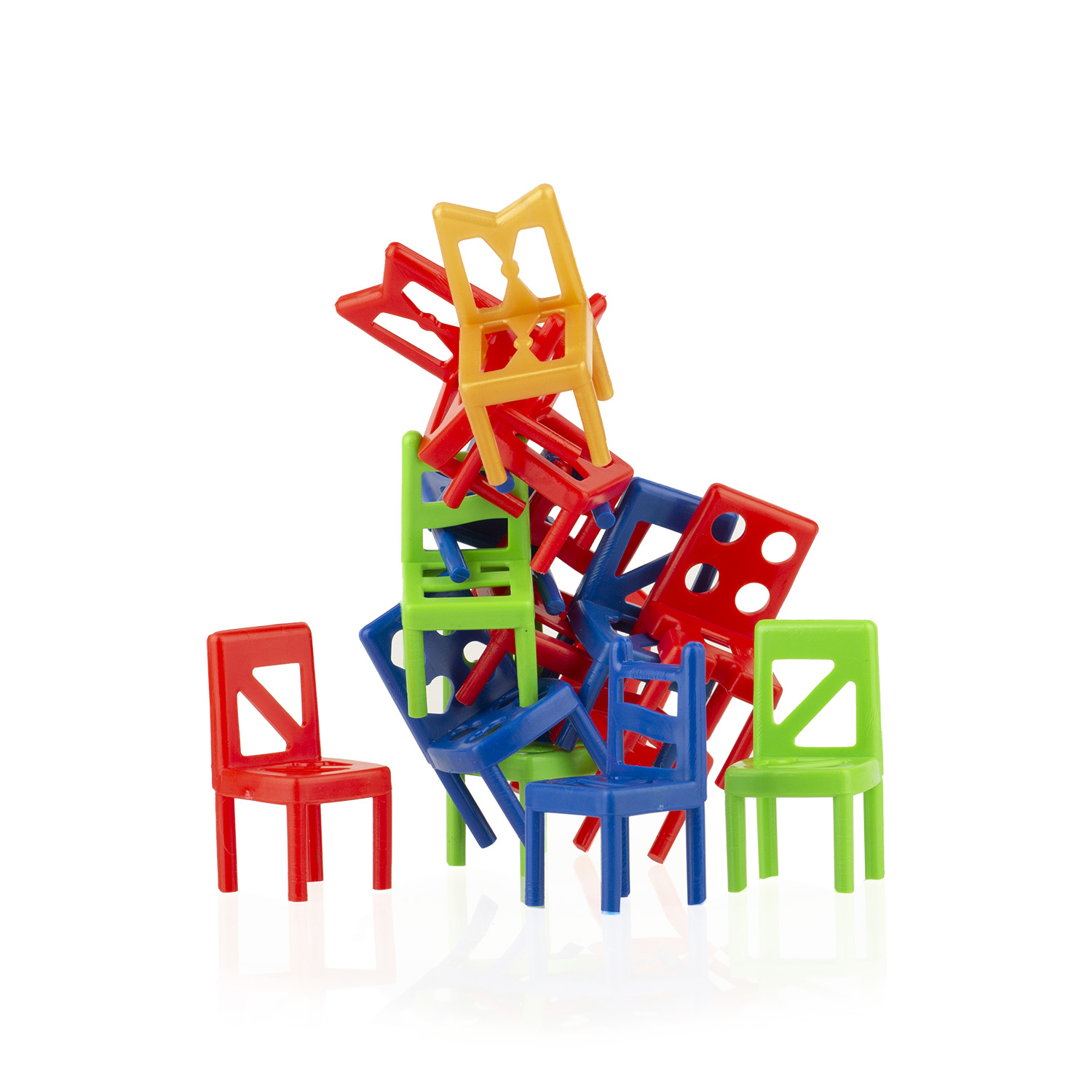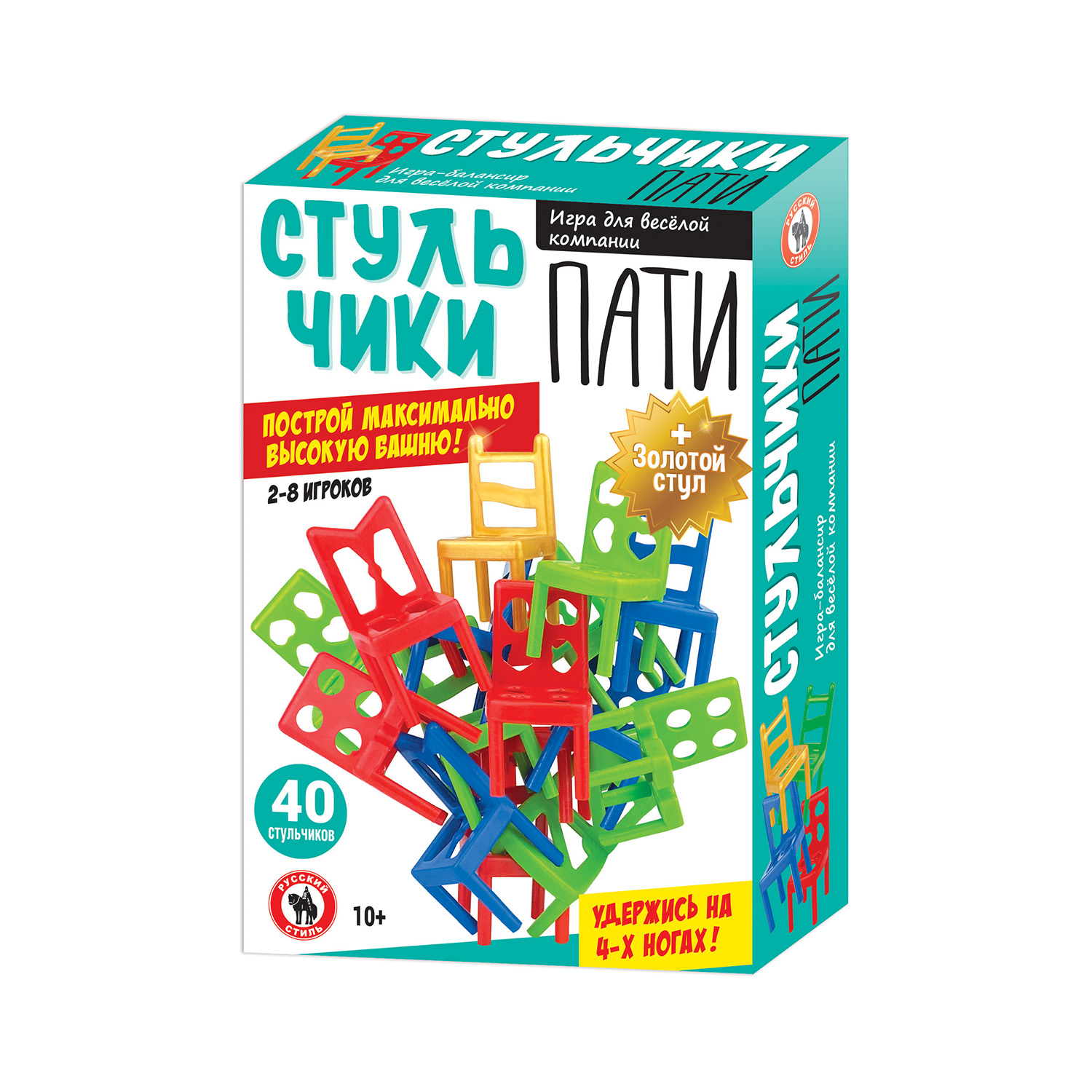 Стульчики – очень популярная игра на ловкость! Игрокам необходимо построить башню из стульчиков таким образом, чтобы конструкция не упала. Цель игры – первым избавиться от своих стульев. Стульчики можно соединять друг с другом любой стороной: ставить друг на друга, боком, вверх ногами и т.д. Если в ход игрока конструкция из стульчиков развалилась – игрок забирает себе все упавшие стульчики. В набор входит уникальный золотой стульчик – он дает игроку право один раз отдать два упавших стульчика своему соседу. Игра очень веселая и азартная, развивает ловкость и координацию. Набор подойдет для большой компании и станет отличным развлечением на любой вечеринке. Количество игроков: 2-8 Возраст: 10+ Состав игры: 40 стульчиков Материал: пластмасса