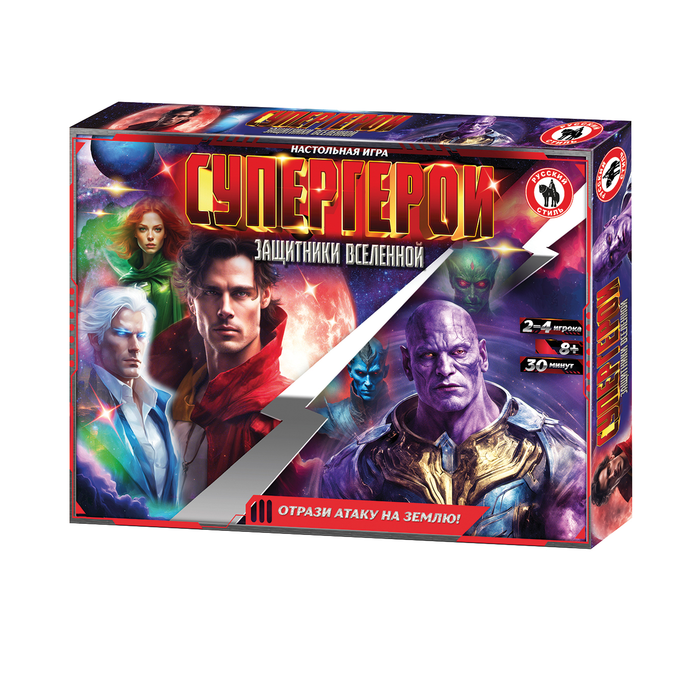 Галактика в опасности! Вражеский флот стоит у самой Земли. Супергероям нужно объединиться, чтобы защитить родную планету и спасти мир. В настольной игре «Супергерои. Защитники вселенной» игрокам предстоит уничтожать вражеских разведчиков, отражать атаки на Землю и собирать уникальное оружие, которое не позволит враждебной расе захватить планету. Это командная игра, в которой победа зависит от действий каждого участника. Чтобы спасти галактику, игрокам предстоит продумать тактику боя и эффективно использовать суперспособности каждого из игроков-супергероев. Количество игроков: 2-4 Возраст: 8+ Состав игры: игровое поле, карточки – 50 шт., фишки – 5 шт., кубик, правила. Материал: картон, бумага, пластмасса