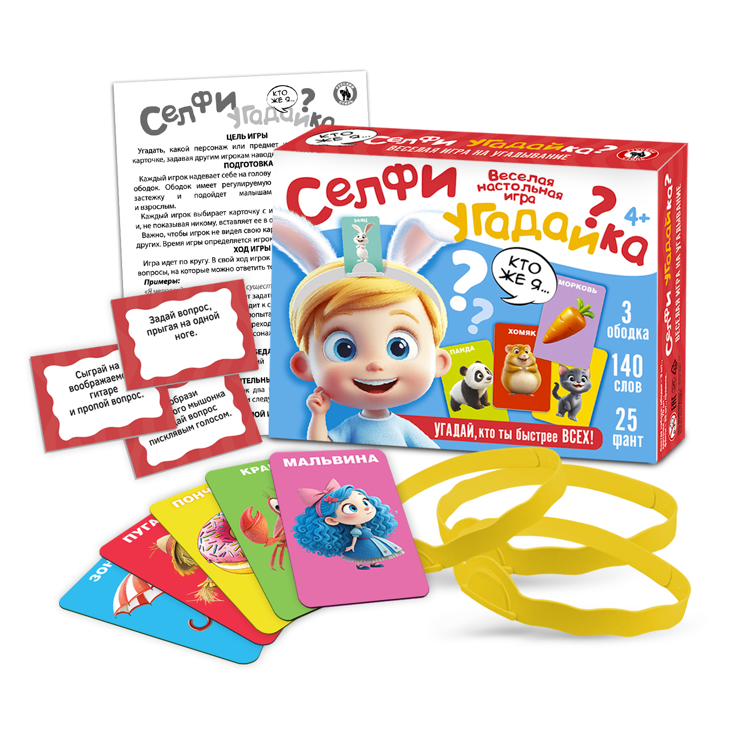 Игра "Селфи Угадайка" - веселая настольная игра, для идеального развлечения, семейных вечеров и встреч с друзьями. В комплекте 3 ободка из мягкого пластика, расширенный набор карточек: 140 забавных персонажей, дополнительные условия игры и карточки с фантами.