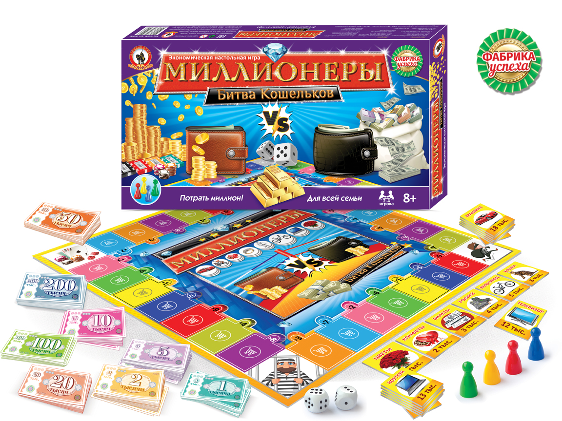Добро пожаловать в мир миллионеров и их толстых кошельков! Заработайте свой собственный МИЛЛИОН и потратьте его с ШИКОМ и БЛЕСКОМ, поборовшись за звание самого крутого и бесшабашного богатея на игровом поле. Удача и отличное знание таблицы умножения помогут вам одержать победу. Игра рассчитана на 2 – 4 игроков и предназначена для детей и их родителей в возрасте от 8 лет.