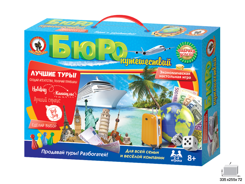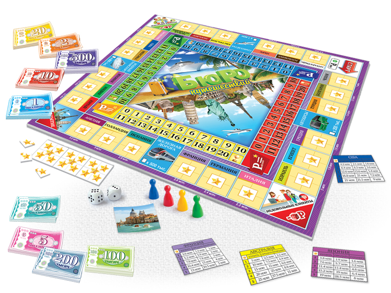 "Бюро путешествий" - это экономическая настольная игра, которая позволит весело провести свободный вечер в компании друзей или в семейном кругу. Главная цель каждого игрока после открытия собственного агенства - продавать туры, чтобы получать как можно больше прибыли. Правила данной игры очень похожи на те, что есть в любимой многими "Монополии", а потому освоится в ней сможет каждый желающий.