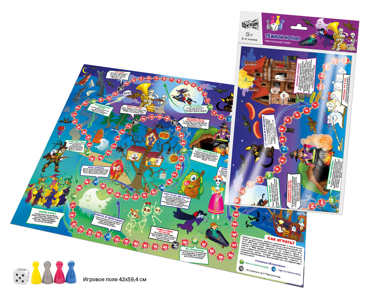 В наборе большое красочное поле размером 594/420 мм; кубик и 4 фишки необычных цветов: серебристая; малиновая; королевско-синяя и ярко-желтая.