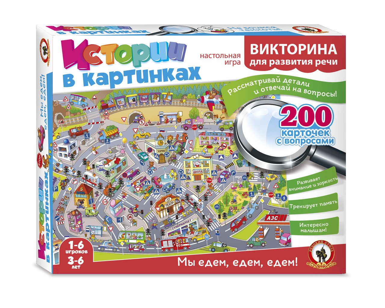 Все малыши любят рассматривать красивые яркие картинки, особенно, если они рассказывают весёлые истории. Наша серия викторин «Истории в картинках» – это не просто рисунки для развлечения, а увлекательная развивающая игра с простыми правилами, которая поможет малышам получить больше знаний об окружающем мире, цветах и признаках, пополнить словарный запас, развить речь, внимательность, память, навыки порядкового счёта, сравнения чисел и быстроту реакции, научит ориентироваться в пространстве и находить причинно-следственные связи. Игровое поле разглядывать очень интересно, на нем изображен город с множеством улиц, светофоры, дорожные знаки, разнообразные машины, ситуации на дороге и происшествия. В комплекте 200 разноплановых вопросов с ответами для всестороннего развития малышей. В процессе игры взрослый зачитывает вопрос, а малышам необходимо найти на игровом поле нарисованный ответ. Кто быстрее всех нашел правильный ответ, получает призовую карточку со звездочкой. Выигрывает игрок, набравший наибольшее количество звездочек. Состав игры: игровое поле – 1 шт.; карточки с вопросами – 200 шт.; правила игры