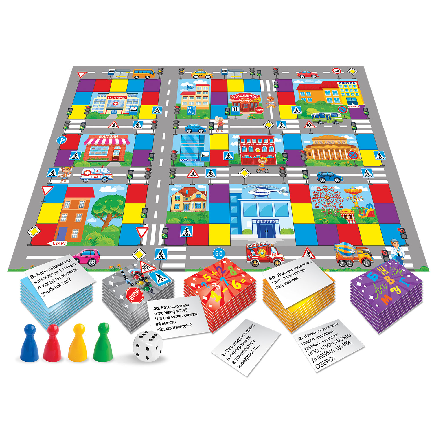В комплект игры входит игровое поле; 400 карточек с вопросами; 4 фишки; кубик и правила.