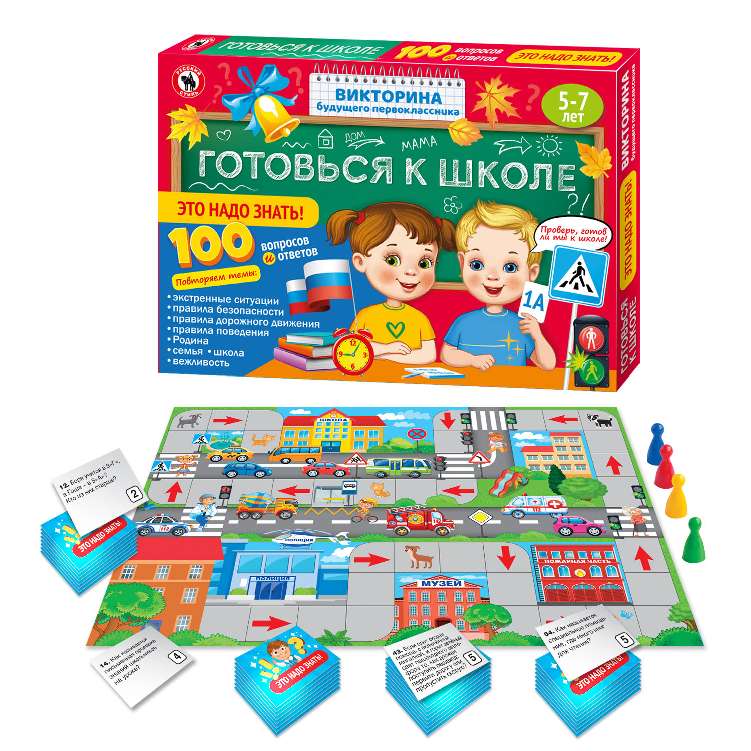 В комплект входит игровое поле; 100 карточек с вопросами; 4 фишки и правила.