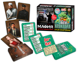 Этот набор включает в себя две самые популярные игры: Мафия и Пати-крокодил! ¶Культовая игра «Мафия» доставит удовольствие и новичкам, и самым искушённым игрокам. Город был захвачен мафией и мирные жители разрабатывают план по спасению. Кто же победит: мафия или мирные граждане? ¶В игре Пати-крокодил участники по очереди становятся ведущими и с помощью жестов объясняют другим игрокам слова, написанные на карточках. Попробуй-ка, изобрази жестами Гоблина, Хакера или Вайфай! На каждой карточке написаны 10 слов разной степени сложности. Помимо карточек с вопросами в комплекте две особые карты: «Такой-сякой», вытянув которую нужно описать загаданное слово с помощью определений, и «Да-Нет», вытянув которую команда задает ведущему вопросы, предполагающие ответ «Да!» или «Нет!». ¶Эти две занимательные игры станут любимым развлечением и предоставят возможность всем участникам проявить смекалку, эрудицию и актёрские способности!¶Компактные размеры игры позволят взять ее с собой и весело провести время с друзьями где бы вы не находились. Набор подойдет для компании от 3 до 17 человек в возрасте 12+.¶В наборе: Карточки Пати-Крокодил – 72 шт., карточки Мафия – 18 шт. правила – 2 шт.