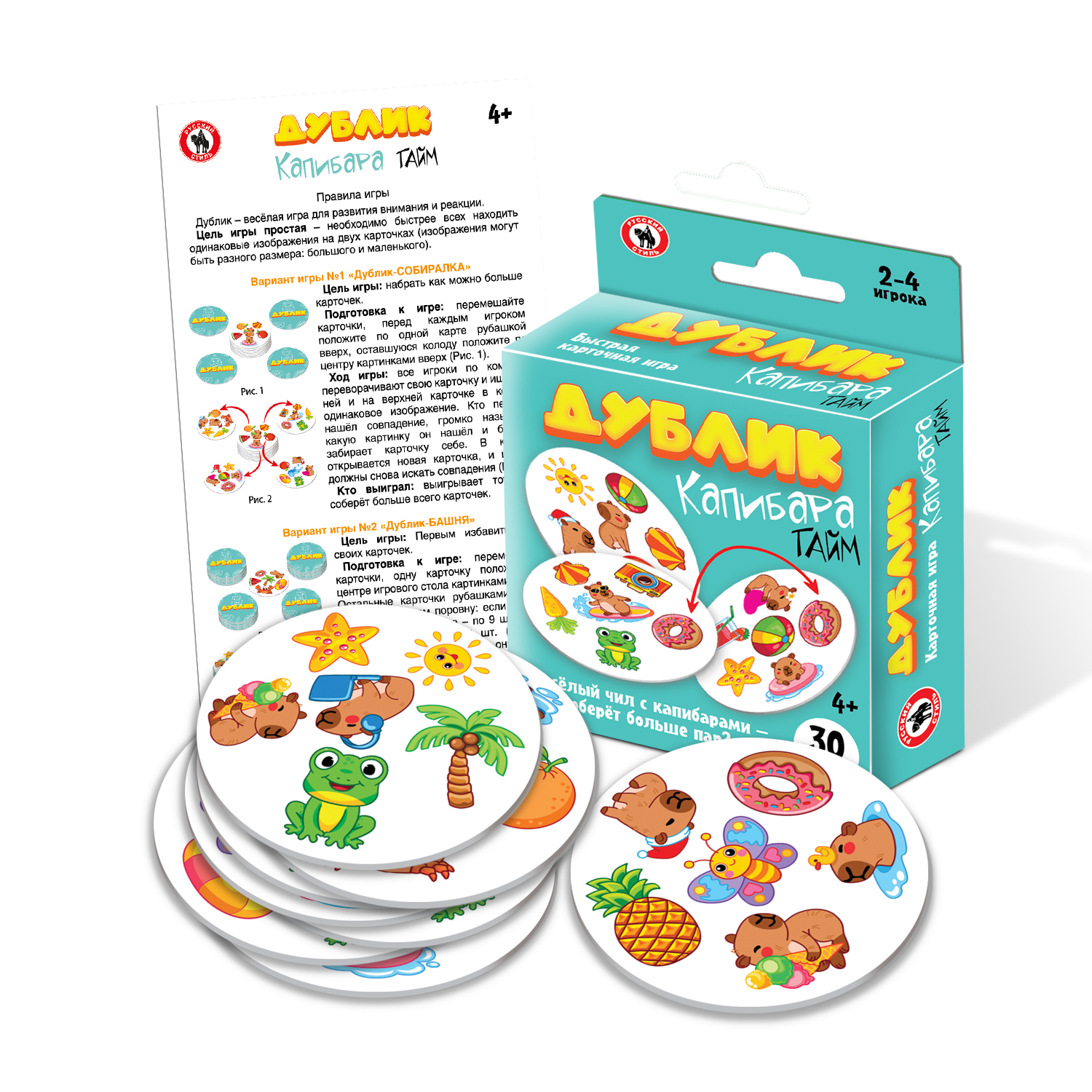 «Дублик» – это игра, которая сможет развеселить и увлечь каждого! В комплекте карточки с разным набором картинок на тему капибар. Игрокам необходимо найти совпадающие изображения быстрее всех, кто больше всего наберет карточек – выигрывает. Память, скорость и внимание будут главными помощниками в этой игре. Набор карточек упакован в компактную коробку, ее удобно взять с собой в поездку. Игра подойдет для 2-4 игроков. Возраст 4+. В комплект игры входит 30 карточек и правила игры. Материал: бумага, картон.