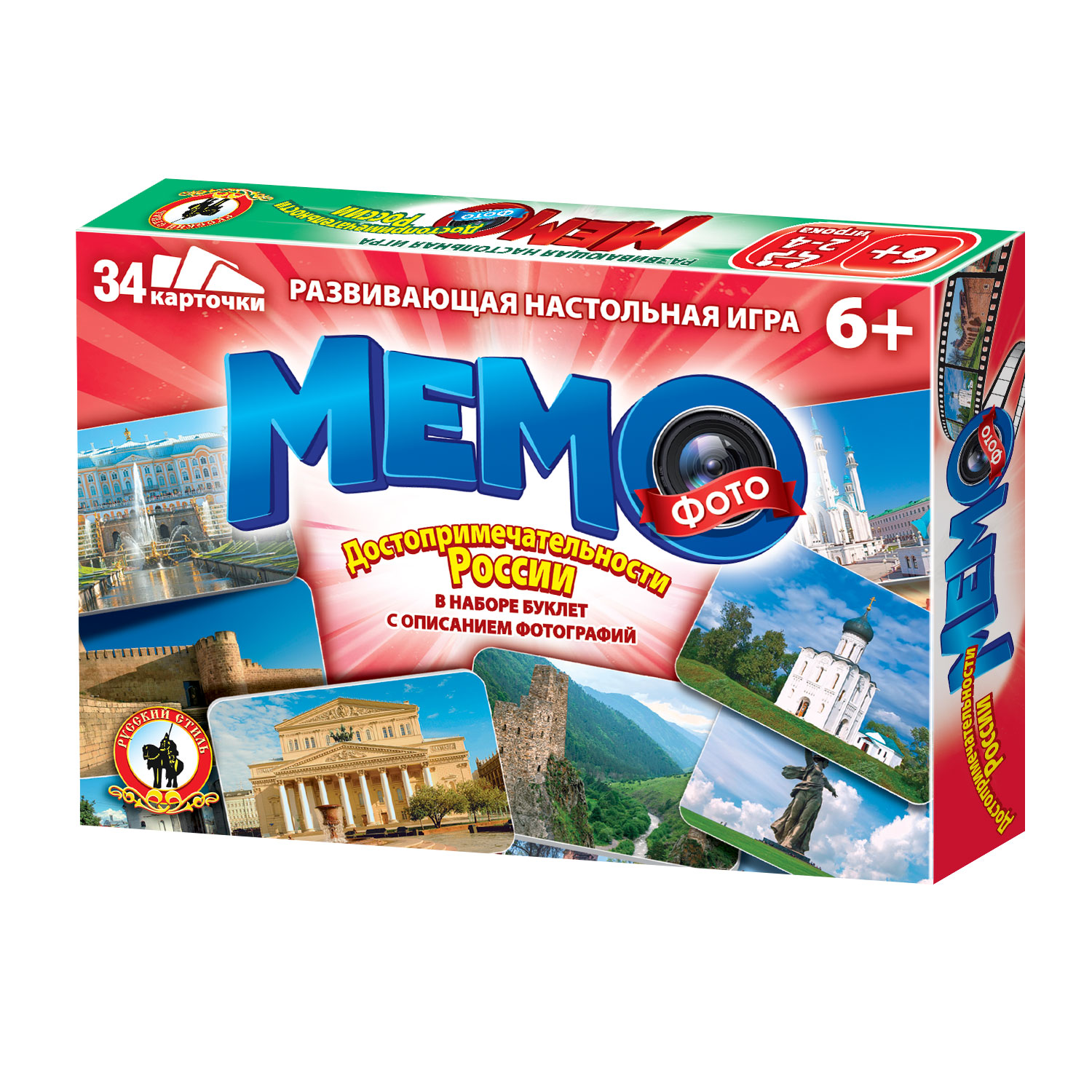 Мемо - увлекательная игра для развития памяти и внимания. Карточки выкладываются на столе рядами рубашкой вверх, в свой ход игрокам необходимо открыть две одинаковые карточки. Выигрывает тот, кто наберет больше всего парных карточек. Россия – страна с многовековой историей и богатой культурой, ее просторы поражают воображение. Восхитительные памятники архитектуры и уникальные достопримечательности раскинулись от Балтики до Тихого океана. Некоторые архитектурные и историко-культурные памятники на территории Российской Федерации внесены в список объектов Всемирного Наследия ЮНЕСКО. В этом наборе собраны фотографии самых известных и интересных достопримечательностей нашей страны. В наборе 34 карточки, буклет с описанием фотографий. Для 2-4 игроков. Возраст 6+. Материал: картон, бумага.