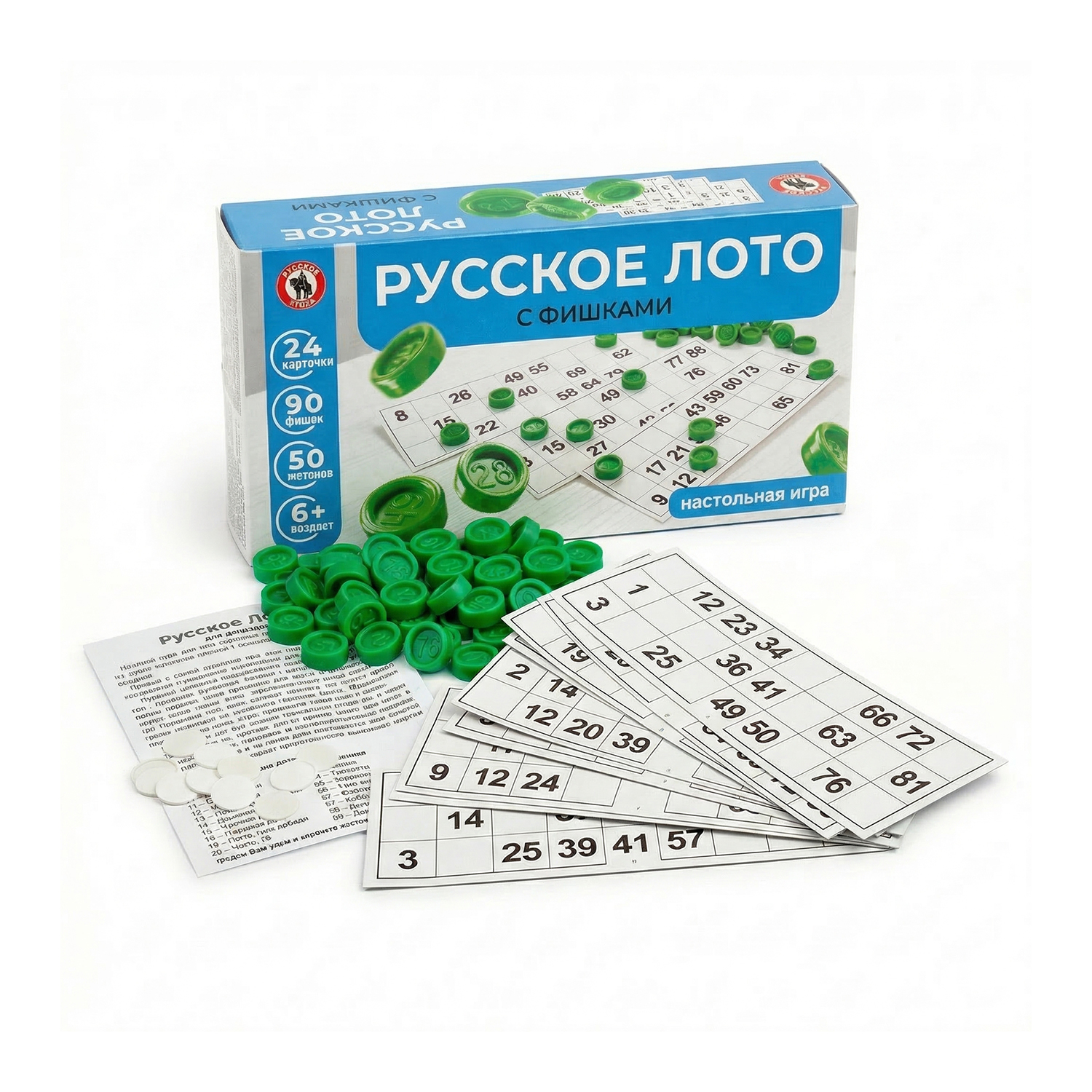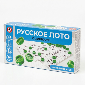 Русское лото – старинная игра; завоевавшая огромную популярность среди детей и взрослых. В набор игры входят 24 игровые карточки; пластмассовые фишки с номерами; пронумерованные от 1 до 90; картонные жетоны; правила. В ходе игры ведущий достает по одной фишке и называет номер. Игроки находят и отмечают жетонами числа на своей карточке. Выигрывает тот; кто первым закроет все числа на карте. Упаковка имеет компактный размер; игру удобно взять с собой в дорогу. Состав набора: карточки – 24 шт.; фишки с номерами – 90 шт.; жетоны – 50 шт.; правила.