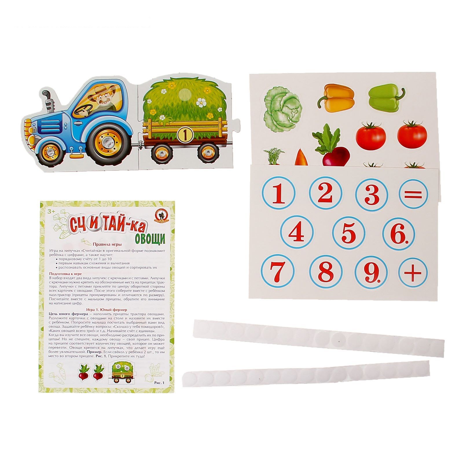 Игра на липучках «Считай-ка» в оригинальной форме познакомит Вашего ребёнка с цифрами. А также научит: • порядковому счёту от 1 до 10 • первым навыкам сложения и вычитания • распознавать основные виды овощей и сортировать их Игра предназначена для детей от 3 до 7 лет и их родителей. Яркие картинки, пазлы и оригинальный крепёж элементов на липучках делают обучающую игру невероятно увлекательной! Состав игры: • Элементы пазла-трактора – 6 шт. • Карточки-овощи – 15 шт. • Карточки с цифрами – 17 шт. • Липучки – 30 шт. • Правила игры