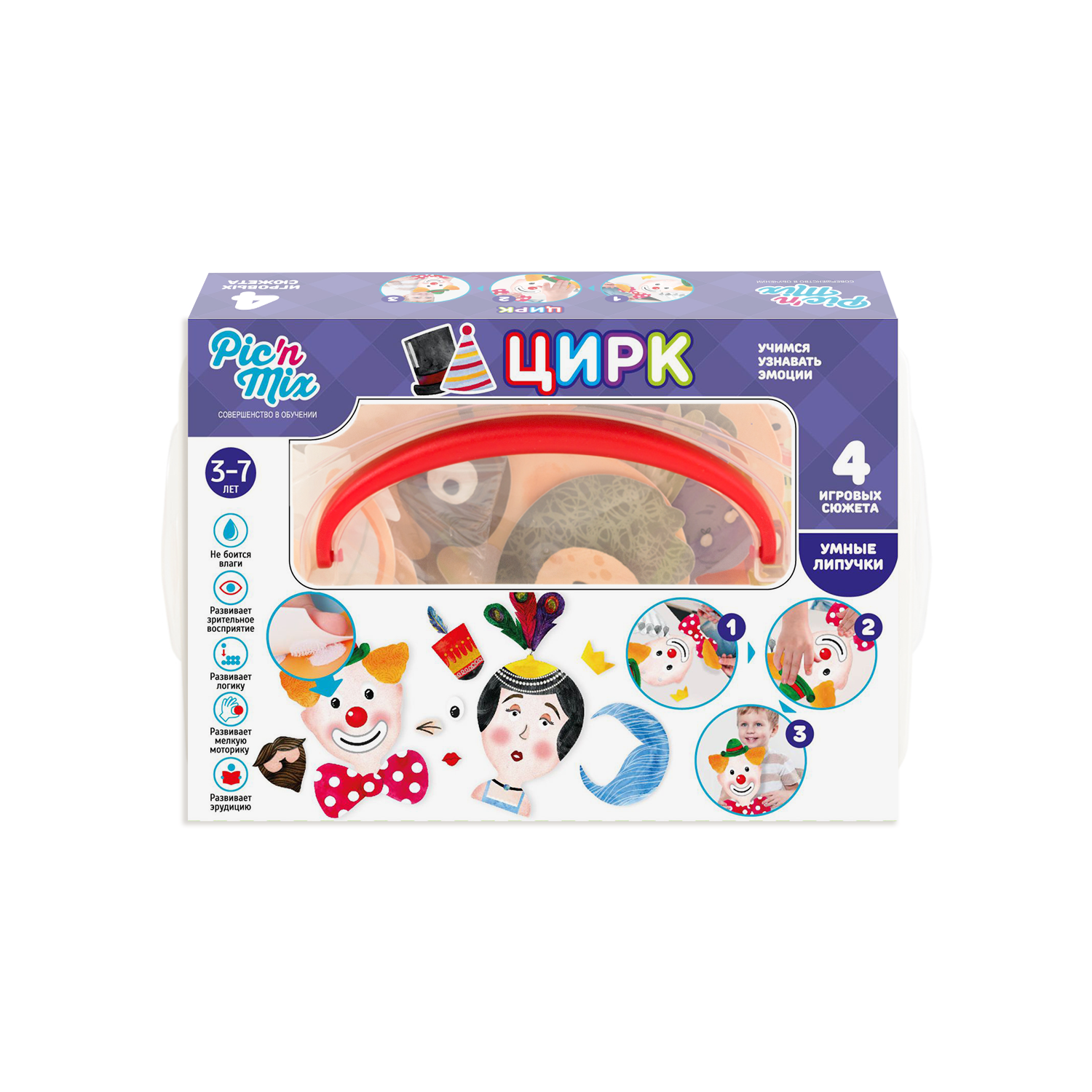 Набор ЦИРК отличный помощник в формировании эмоционального интеллекта Вашего ребенка. В ходе игры изучайте с ребенком названия эмоций, их оттенки и ситуации, для которых они характерны. Объясните ему, как эмоции отражаются на лице, и какие причины могут их вызывать. В ходе игры развиваем эмоциональный интеллект, логическое мышление, речевое общение, кругозор, внимание. Тренируем моторику рук, зрительную память, восприятие формы и цвета.