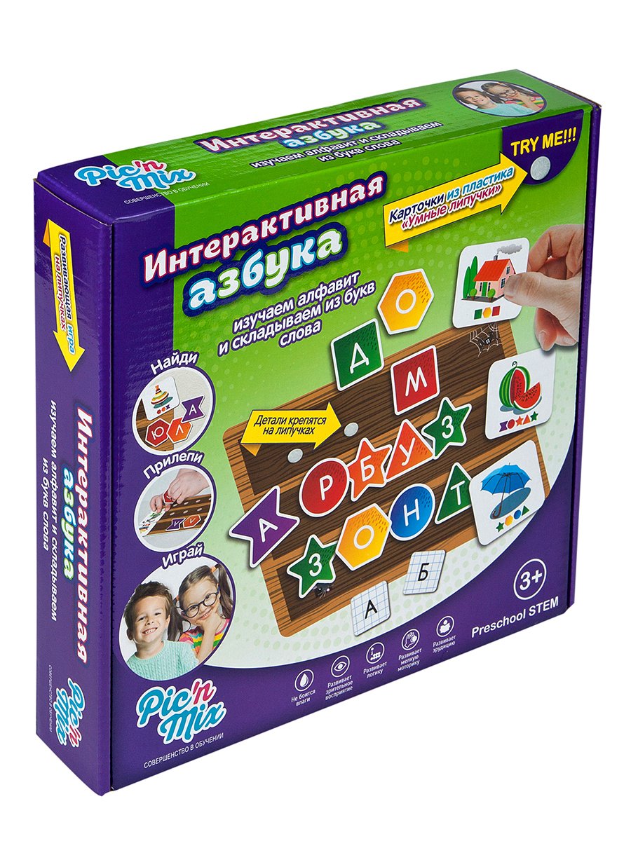 Обучающая игра пазл-липучка "Интерактивная азбука" изучаем алфавит и складываем из букв слова. Поможет Вашему малышу сформировать четкое представление об азбуке и буквах; и несомненно; принесет успехи в обучении чтению. Игра состоит из игрового поля; комлпекта карточек ( 30 штук) с изображением предметов и заданий-подсказок; а также комлекта букв; изображенных на фото цветных геометрических фигур ; и комплекта букв на фоне тетрадного листа. Игра стимулирует развите мышления; воображения; внимания; координации мелкой моторики; расширяет общий словарный запас ребенка.