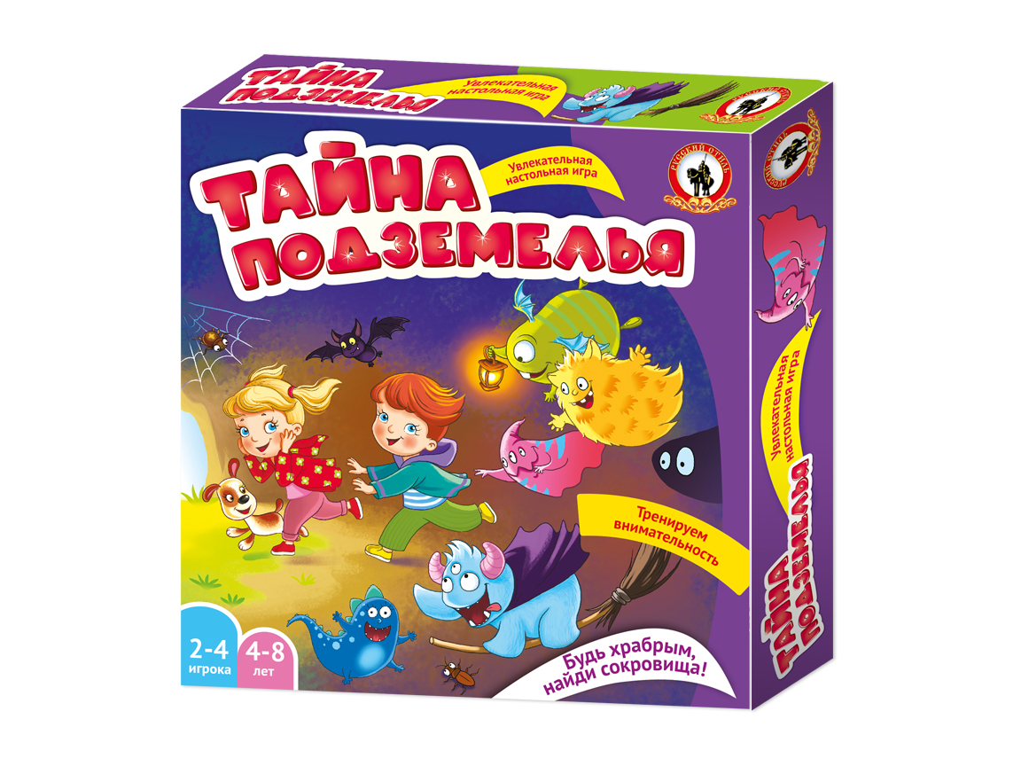 Формат игрового поля очень необычный: поле состоит из 11-ти полосок, которые в ходе нужно переворачивать. Загадочное подземелье веками хранит в себе множество тайн, сокровищ и опасностей. Там хранится клад и живут озорные привидения. Переворачивая сегменты игрового поля, детям предстоит исследовать подземные лабиринты, перемещаясь по тематическим клеткам, разгадать все секреты, не запутаться в паутине и найти сокровища! Все детали игрового поля выполнены из плотного картона. В процессе игры дети потренируют быстроту реакции и внимательность. Состав игры: детали игрового поля – 11 шт., карточки игроков – 4 шт., карточки сундуков – 12 шт., карточки зажигания фонаря – 4 шт., карточки хода игры – 20 шт., правила игры. Возраст 4+