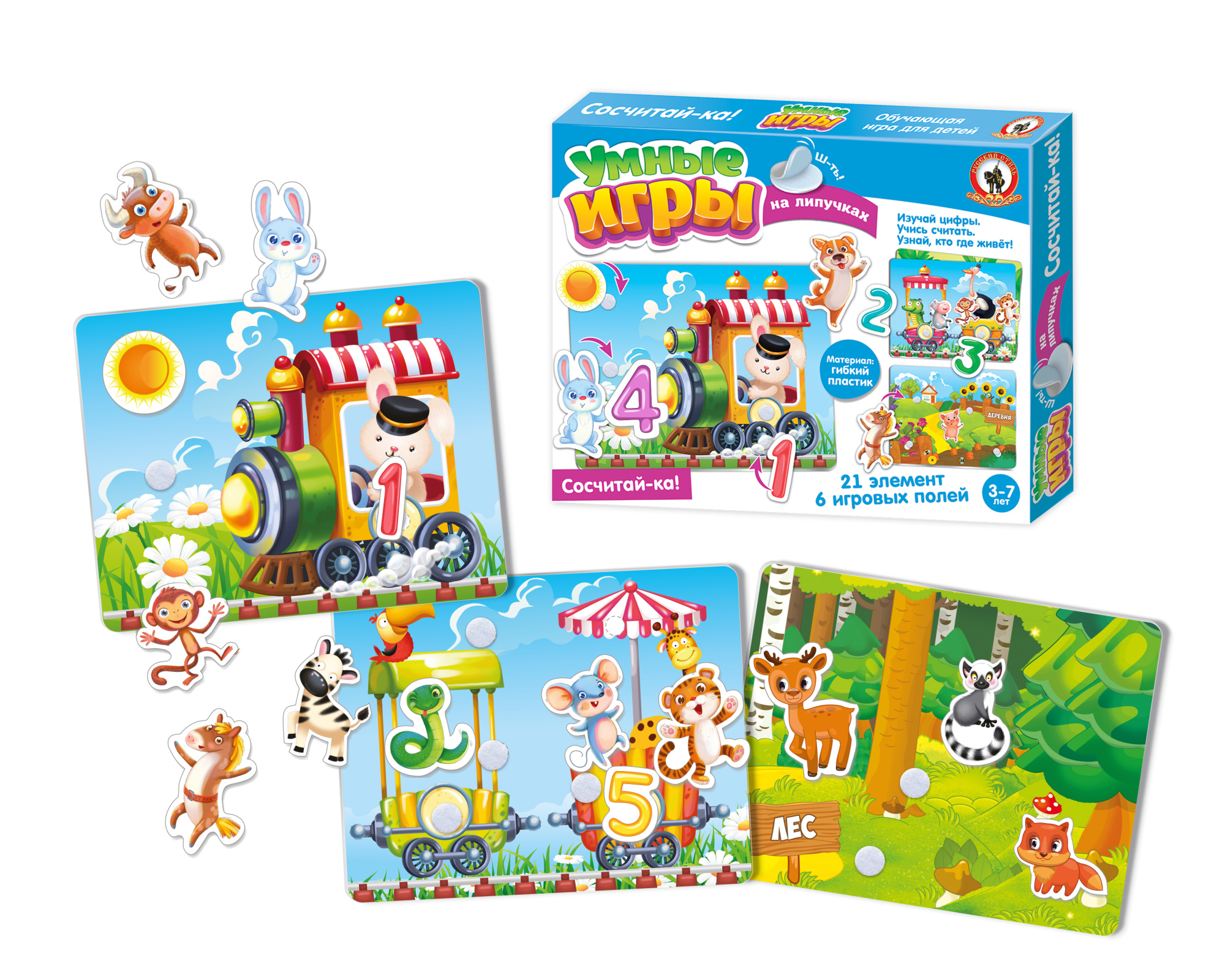 Серия «Умные игры на липучках» – это развивающие игры с дидактическими заданиями для малышей. Играя; дети изучат цифры от 1 до 5; потренируют устные навыки счёта; познакомятся с разными животными и узнают; где они живут.