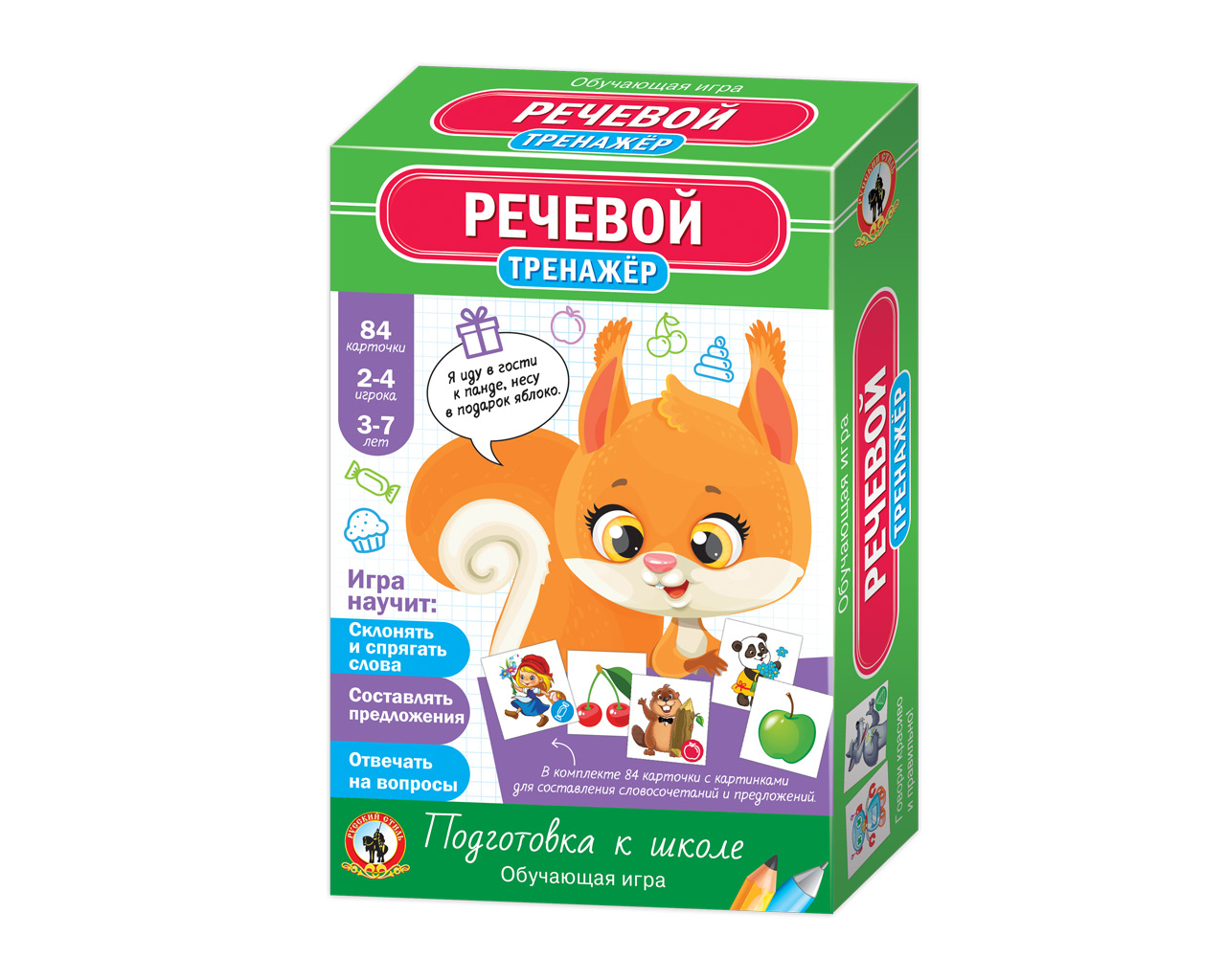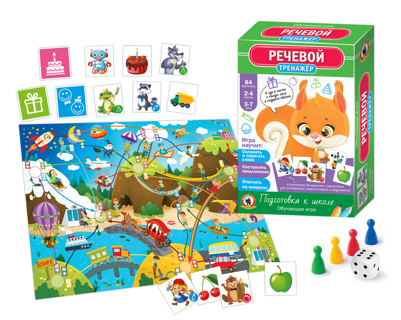 Серия обучающих игр «Тренажёры» – это эффективная многоступенчатая методика; многократно ускоряющая усвоение детьми учебного материала; изучаемого в дошкольном и младшем школьном возрасте. «Речевой» тренажёр пополнит словарный запас ребёнка; научит согласовывать слова по родам; падежам; числам и поможет быстрее перейти от умения составлять словосочетания к умению строить целые предложения. Игра рекомендована как для индивидуальных занятий с детьми; так и занятий в группе. Для 2–4 игроков. Возраст 3 – 7 лет. Состав игры: игровое поле – 1 шт.; кубик – 1 шт.; фишки – 4 шт.; карточки – 84 шт.; правила игры. Материал: бумага; картон; пластмасса.