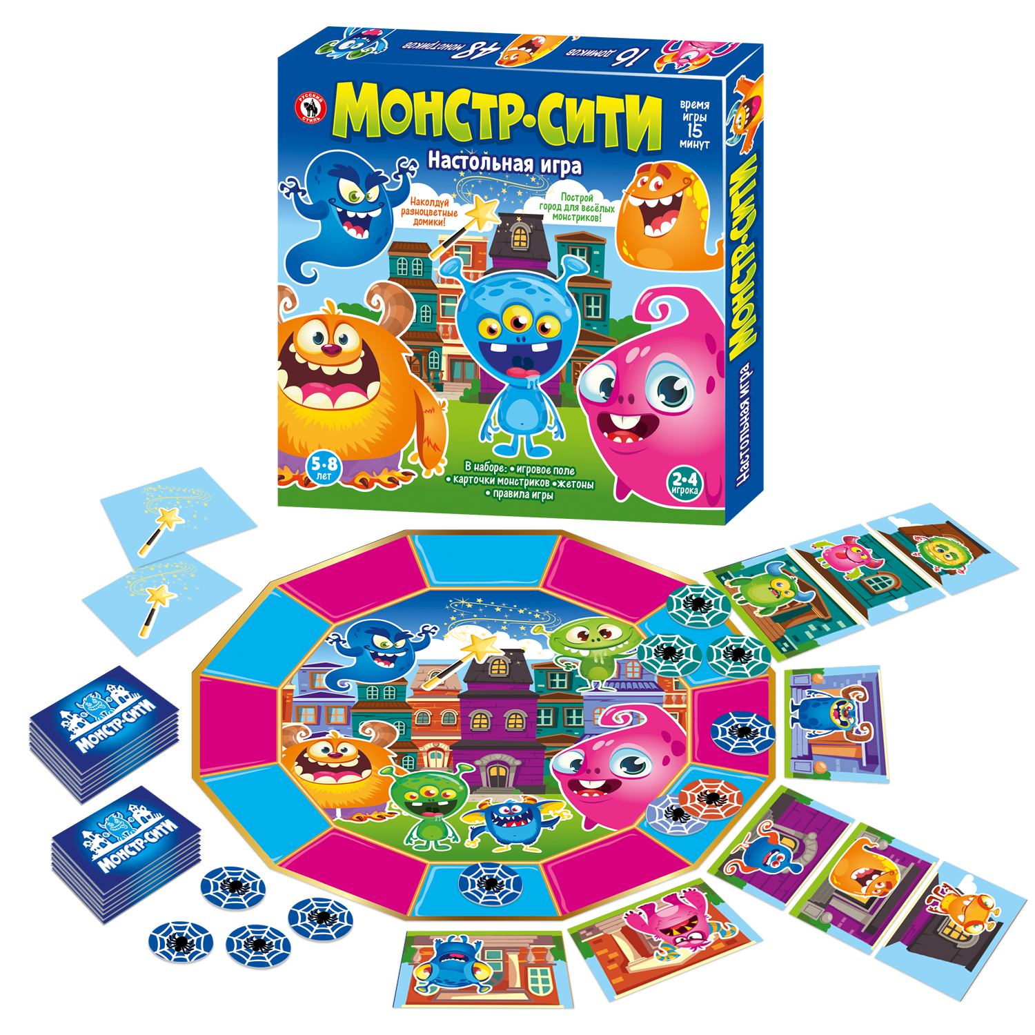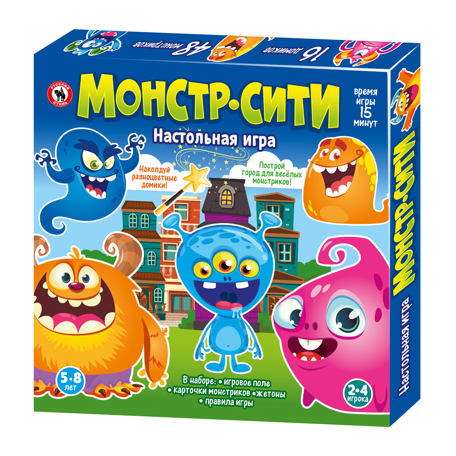 В Монстр-сити перессорились все монстрики! Каждый монстрик хочет, чтобы его дом был самым ярким, самым высоким, а коврик перед ним – самым круглым. Игрокам предстоит наколдовать монстрикам новые дома так, чтобы все остались довольны. А справиться с этим смогут только настоящие чародеи! Игроки в свой ход выкладывают карточки с изображением домиков, начиная с первого этажа. Цель игры – выложить все свои карточки и собрать максимальное количество домиков. А поможет в этом внимание, смекалка и волшебная палочка. Игроки научатся быть внимательными, запомнят цвета и потренируются в понятии больше-меньше и порядковом счете. Количество игроков: 2-4 Возраст: 4-8 лет Состав игры: игровое поле, карточки – 50 шт., жетоны – 48 шт., правила игры. Материал: картон, бумага