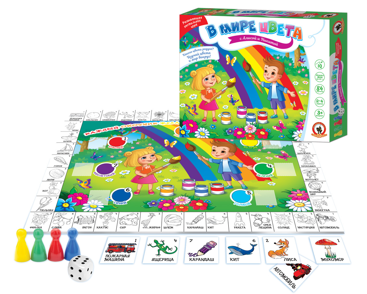 Весёлые друзья Алиса и Никита приглашают отправиться в увлекательное путешествие в мир цвета! Играя в эту развивающую игру, малыши познакомятся с цветами радуги, узнают, какого цвета бывают предметы и животные вокруг нас, научатся объединять их в группы по цветовому признаку. В комплекте: игровое поле – 1 шт., карточки – 84 шт., фишки – 4 шт., кубик – 1 шт., правила игры.