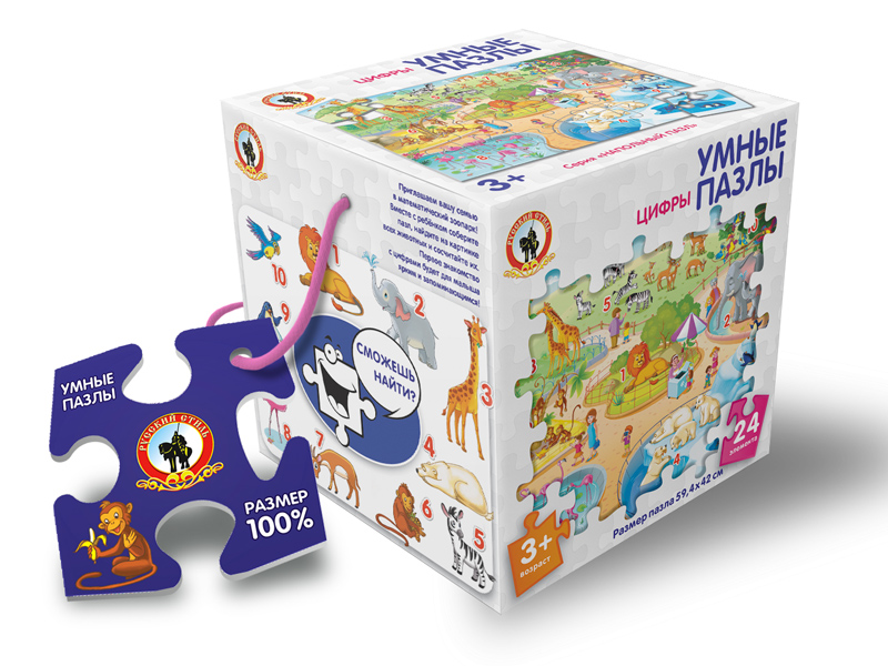 Напольный Умный пазл - это одна из самых любимых детских игр! Такие красочные пазлы развивают моторику и пространственное мышление. А собрав пазл полностью, мы предлагаем выполнить увлекательные и развивающие задания. Задание на счет и сообразительность представлены на одной из сторон коробки. Играя с этим пазлом, малыши познакомятся с цифрами от 1 до 10 и потренируют навыки счета. Этот красивый напольный пазл «Цифры» состоит из 24 деталей. Упаковка имеет ручку-шнурок с образцом пазла в натуральную величину. Размер собранной картинки 594х420 мм.