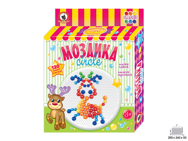 Мозаика Circle – это мозаика на круглой плате. В комплект набора входит книжка-подсказка с примерами рисунков. Игра для детей от 3 лет. Состав набора: • Плата круглая – 1 шт. • Фишки мозаики Ø 10+15 мм – 120 шт. • Книжка-подсказка
