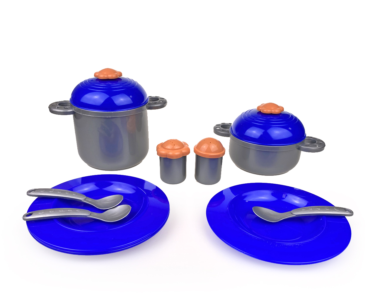 Набор предназначен для сюжетно-ролевых игр дошкольников; состоит из 14 предметов - большая кастрюля; маленькая кастюля;2 крышки с держателем; солонка; перечница; 2 крышки; 3 большие тарелки; 3 ложки. Посуда изготовлена из качественного прочного пластика.