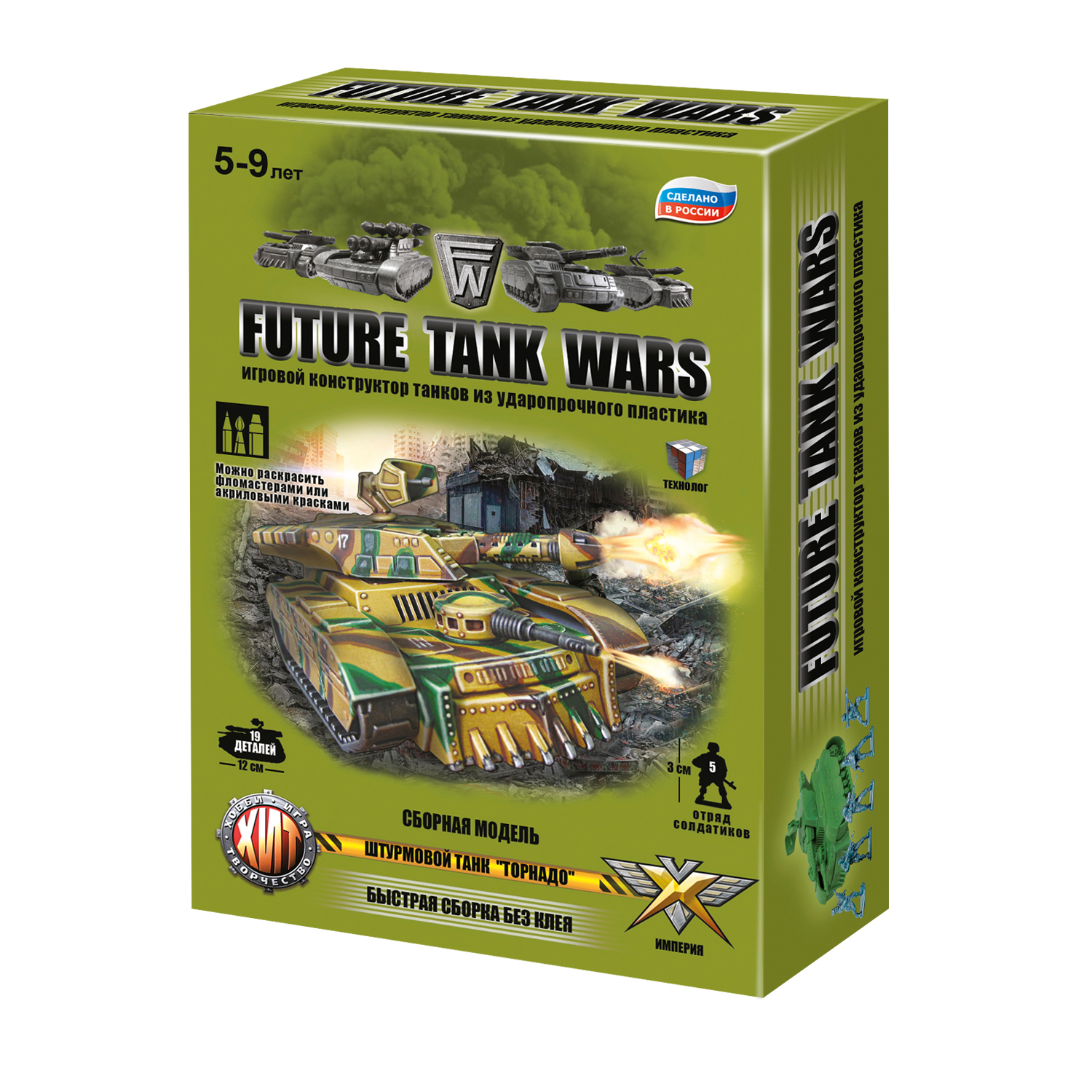 Игровой конструктор танк из ударопрочного пластика. В комплекте: 19 деталей танка для сборки и 1 отряд солдатиков - 5 штук. Модель танка поставляется на литнике; танк можно раскрасить красками или фломастерами.