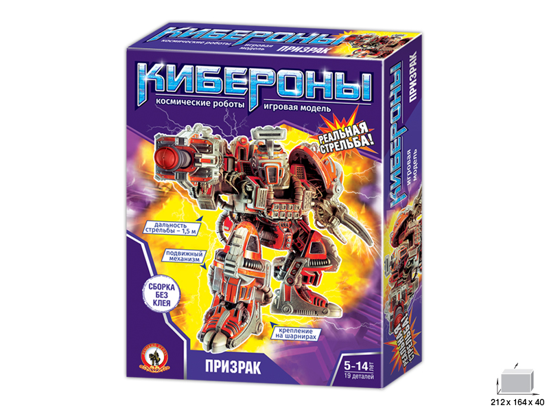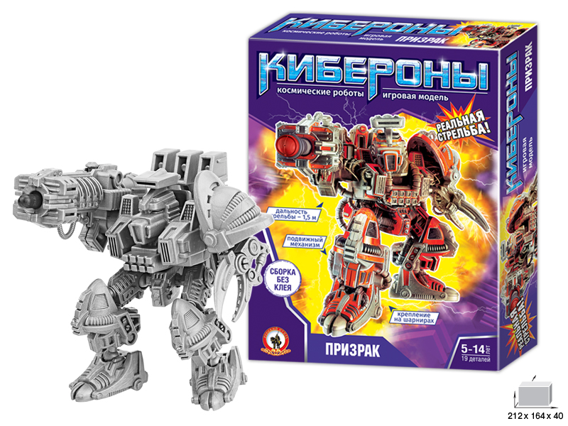 КИБЕРОНЫ – это серия сборных моделей боевых киборгов. Киберон Призрак – супер-воин с боевым оружием; стреляющим пластмассовыми снарядами. Дальнобойность стрельбы – 1;5 метра. Отличительная особенность робота – мощная клешня для поражения соперников. В набор входят детали робота; пластиковые снаряды; подробная инструкция по сборке. Готовая фигурка робота подвижна. Собранную фигурку робота можно раскрасить любыми модельными красками.