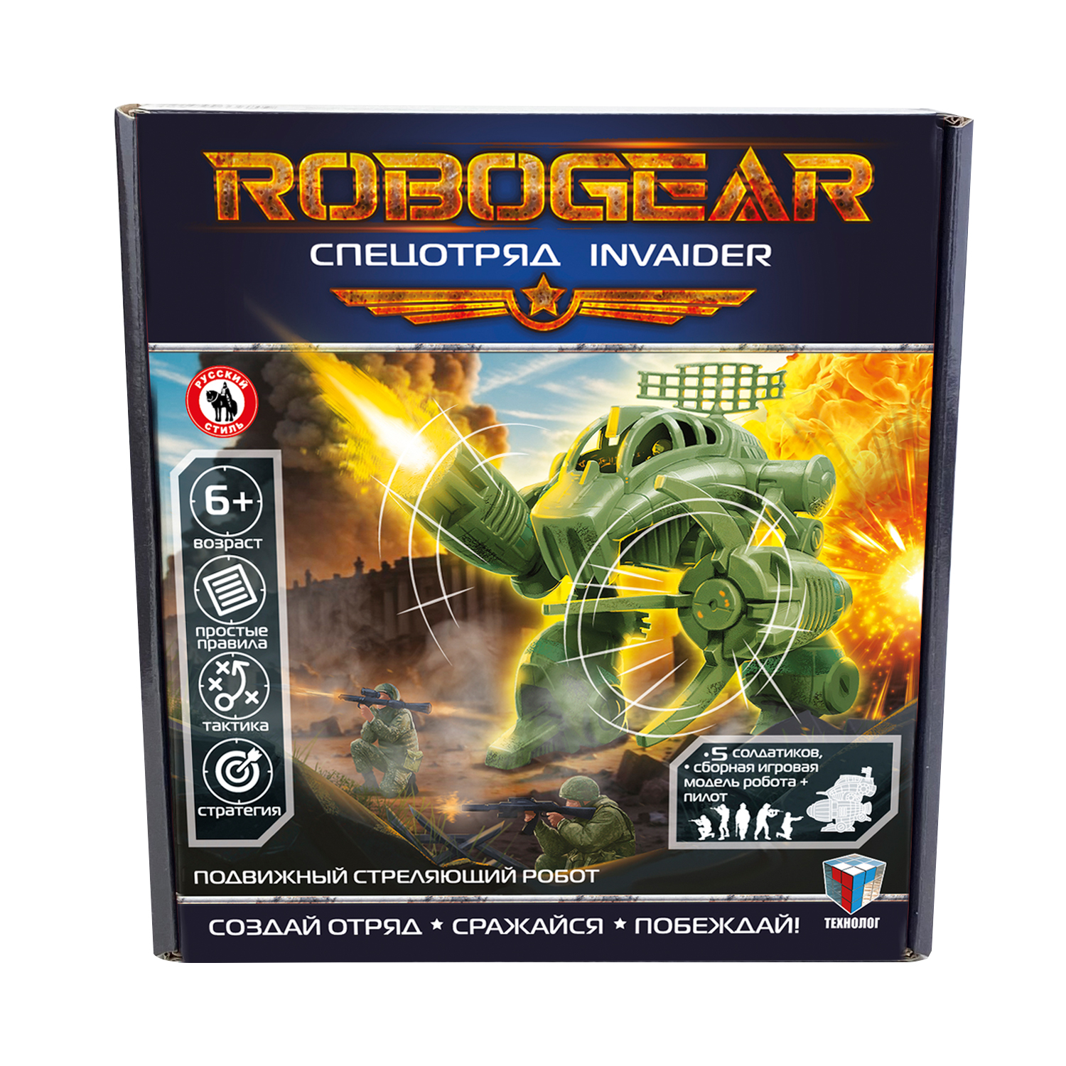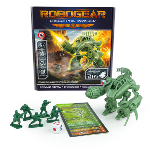Игровой набор серии «ROBOGEAR» Спецотряд INVAIDER представляет собой уникальную сборную модель робота, который управляется пилотом, оснащен стреляющим оружием и дополнен отрядом солдат. Боевой робот отлично сочетает в себе силу, изящество и брутальный дизайн. Благодаря продуманному цветовому окрасу набор подходит как для настольных стратегических игр, так и для коллекционирования. Сборка осуществляется без клея. ¶Состав набора: сборная модель робота, пилот, 5 солдатиков, армлист, схема сборки робота, правила игры, кубик.¶