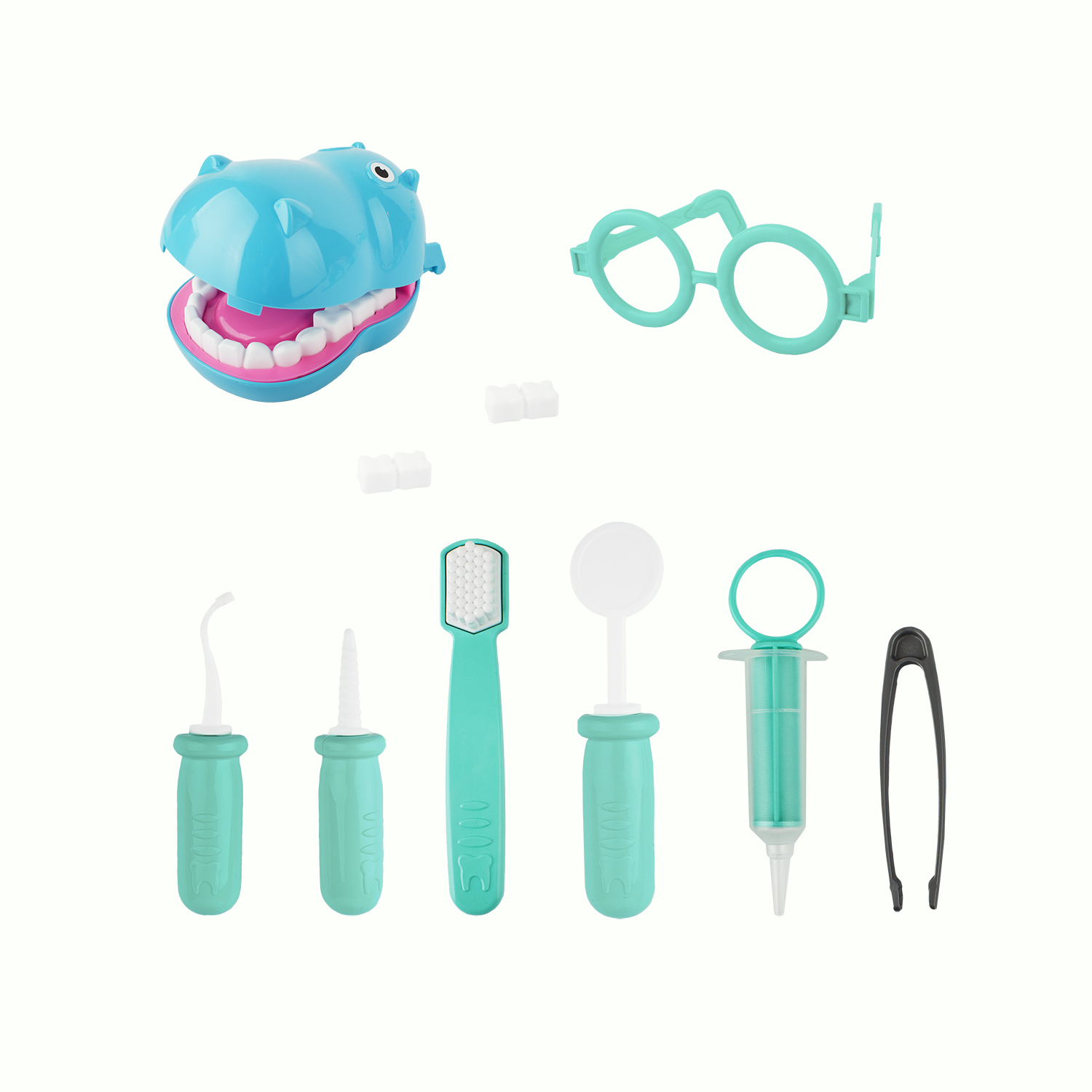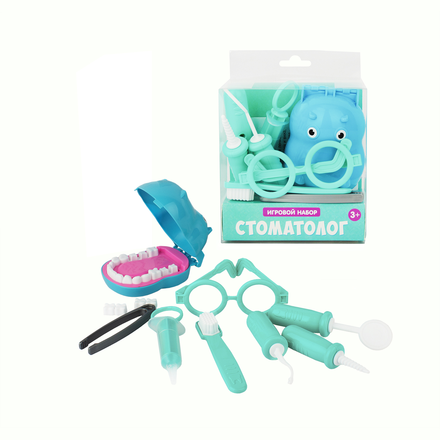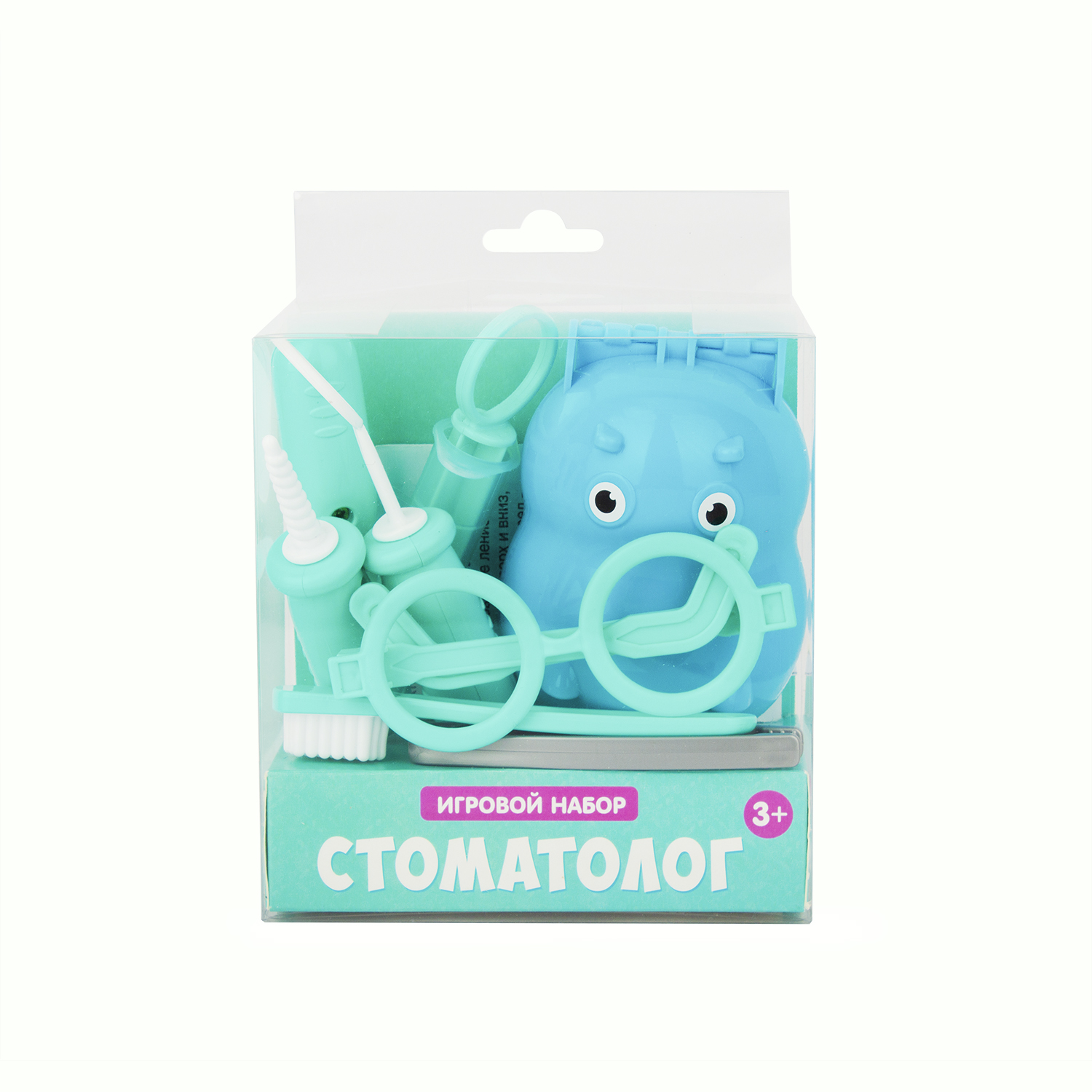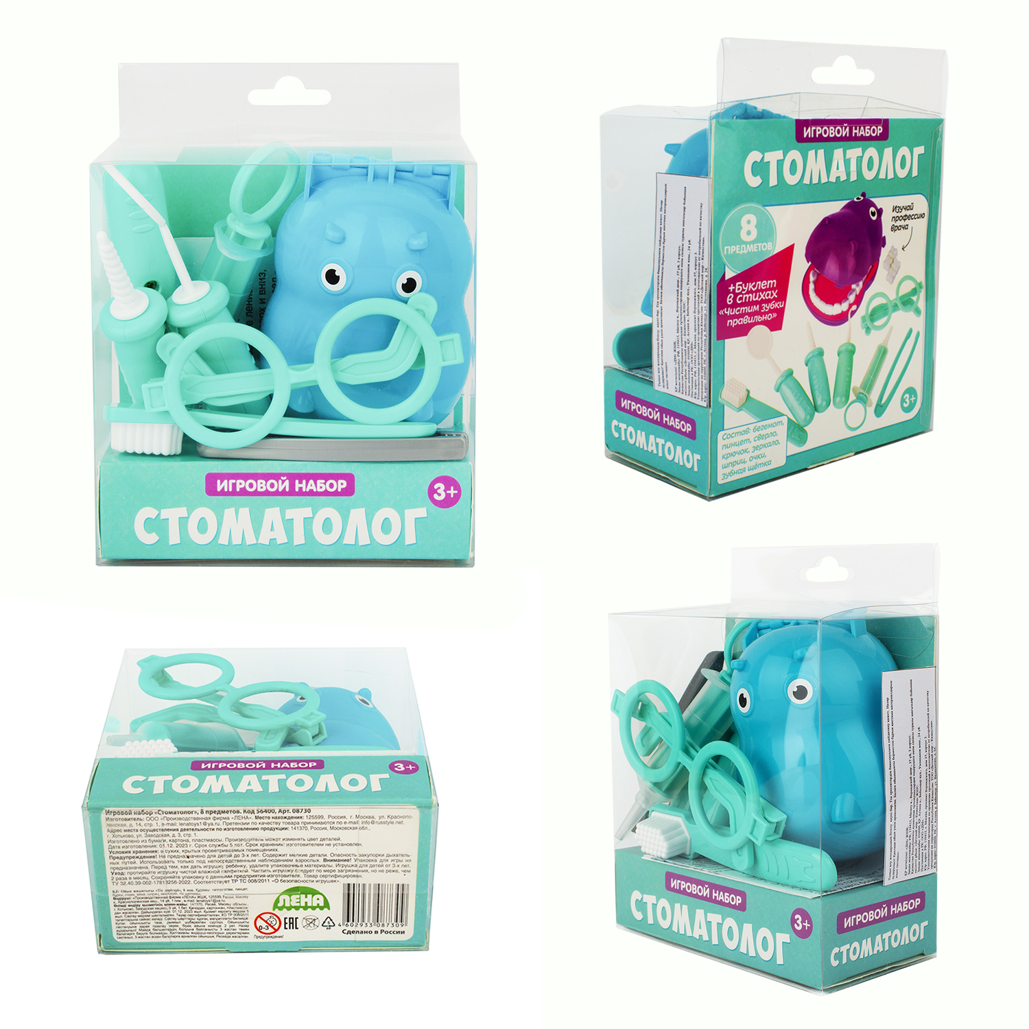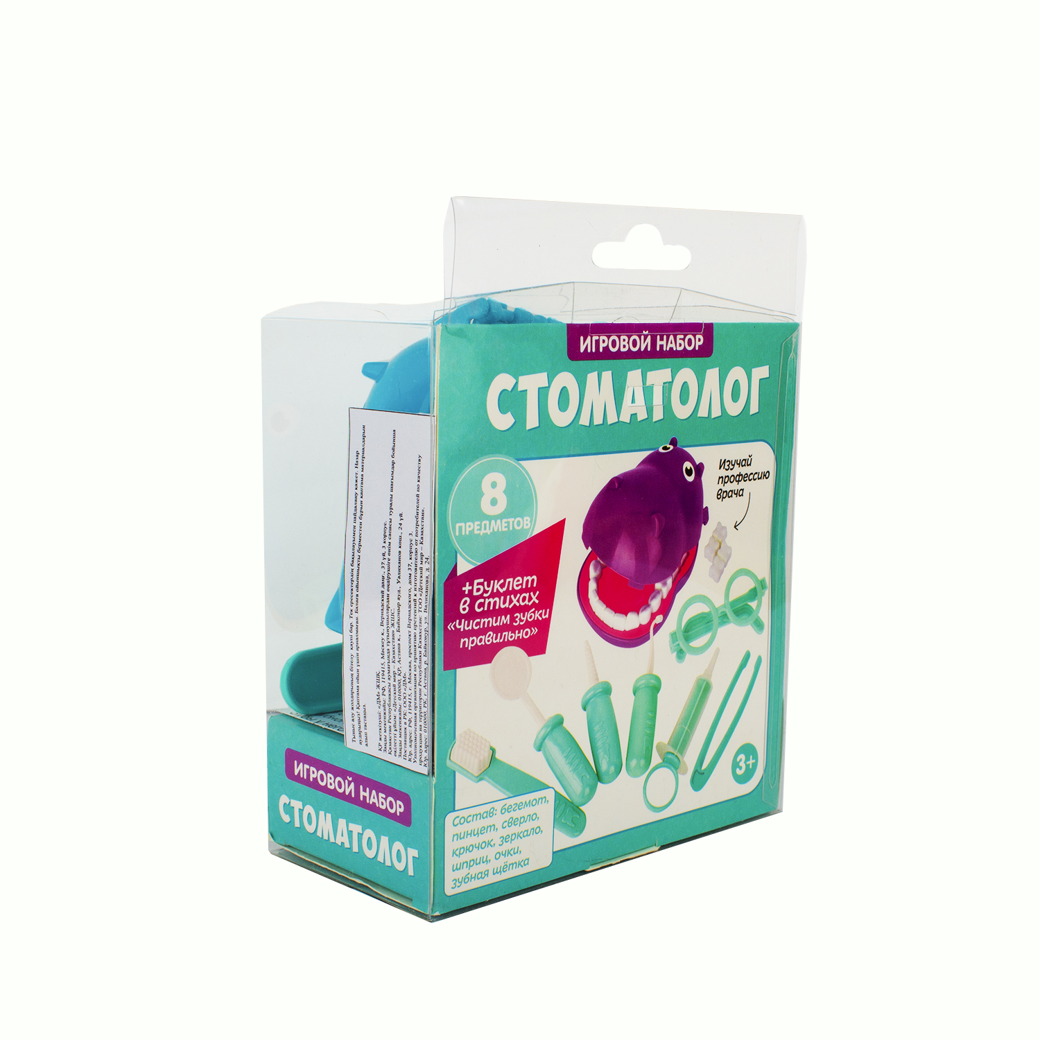 Стоматолог - интересная увлекательная игра для детей! Небольшой игровой набор юного врача - стоматолога познакомит ребенка с этой профессией, процессом лечения зубов, правилами гигиены полости рта, а также поможет справиться со страхами посещения доктора малышом. В комплект игрового набора входят: бегемот с большим ртом и зубками – 1 шт., зубная щетка- 1 шт., пинцет- 1 шт., сверло- 1 шт., крючок- 1 шт., зеркало- 1 шт., шприц- 1 шт., очки- 1 шт., Буклет в стихах - 1 шт.