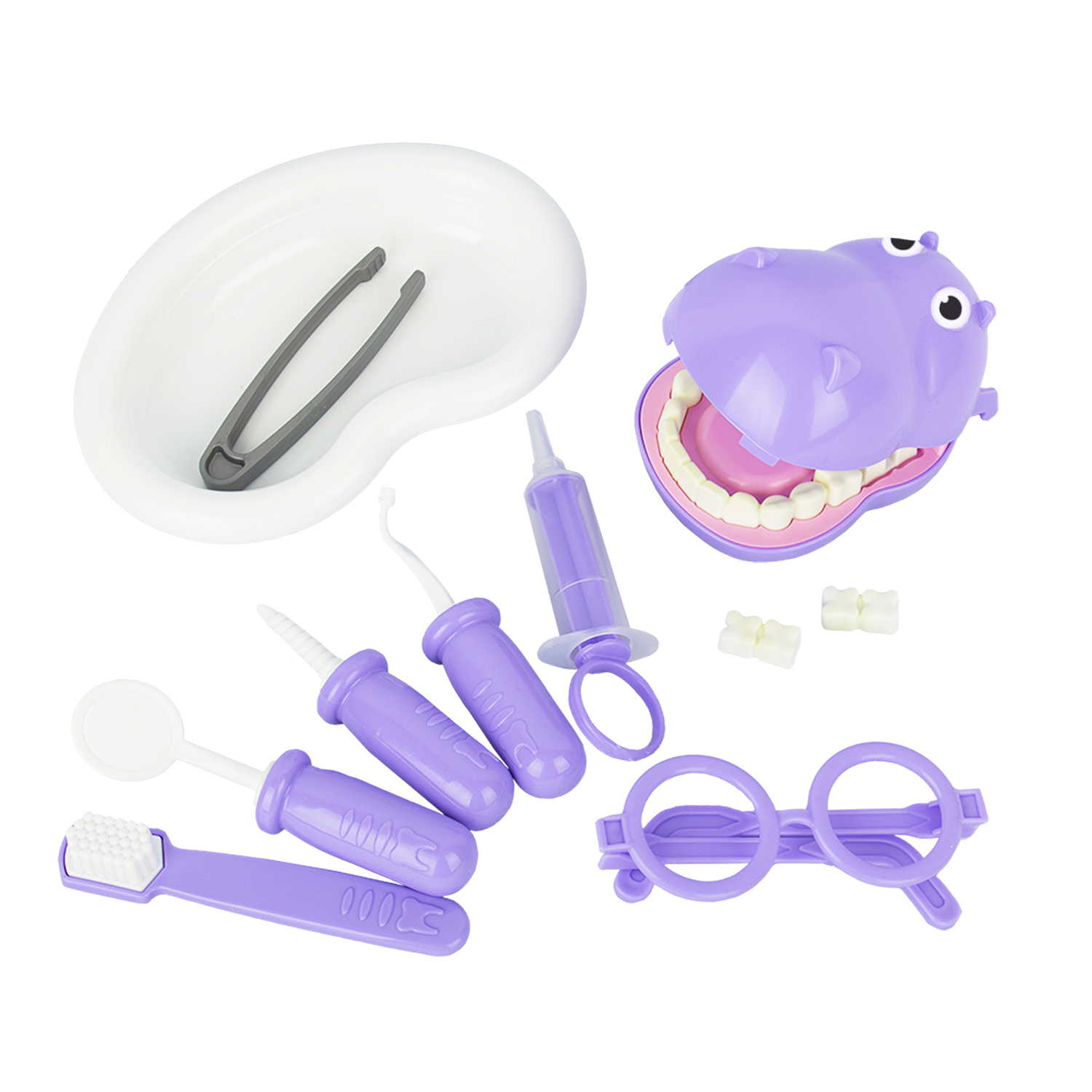 Состав: бегемот, ванночка, пинцет, сверло, крючок, зеркало, шприц, очки, зубная щетка. Игровой набор "Стоматолог" Бегемотик включает в себя набор необходимых аксессуаров для маленького врача, которые создадут увлекательную атмосферу игры. Игра способствует развитию мелкой моторики, координации движений, социально-бытовых навыков, обучает личной гигиене.