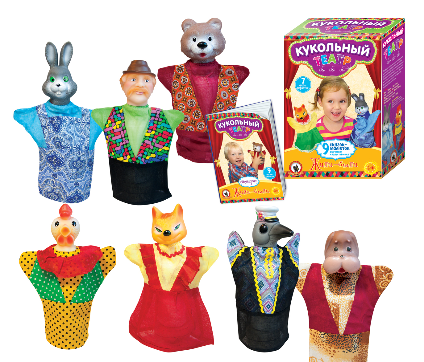 Игра для детей от 3 лет. Состав набора: • Куклы-перчатки – 7 шт. (мужик (охотник), медведь, заяц, лиса, петух, собака, журавль) • Сценарий сказки