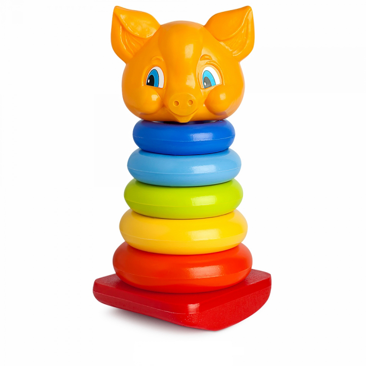 Забавный поросенок порадует вашего малыша в этой нарядной пирамидке. Пирамидка-качалка имеет классическую конусовидную форму; состоит из пяти разновеликих колец.