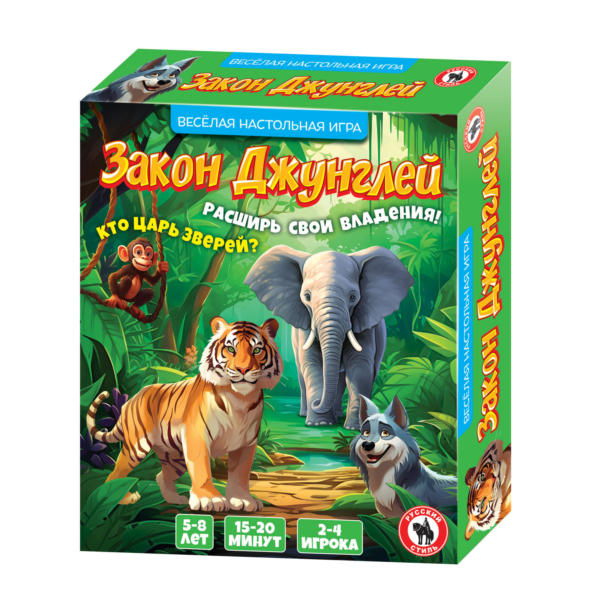 Игрокам предстоит занять как можно большую территорию в джунглях и расселить туда своих животных, набрав наибольшее количество призовых очков. Игроки выкладывают на стол карточки территорий и сверху выкладывают жетон с изображением своего животного. В процессе игры игрокам предстоит объединять свои территории, а также сражаться за территории с другими игроками. Если игрок претендует на завоевание чужой территории, то оба игрока бросают по очереди кубик, и к значению кубика прибавляют число обитающего на этой территории животного. У кого значение больше, тот победил в борьбе за землю. Игра развивает внимательность, логику и навыки устного счета. Дети легко и быстро научатся складывать и сравнивать числа. Количество игроков: 2-4 Возраст: 5-8 лет Состав игры: карточки – 36 шт., кубик – 1 шт., жетоны – 40 шт., правила игры.
