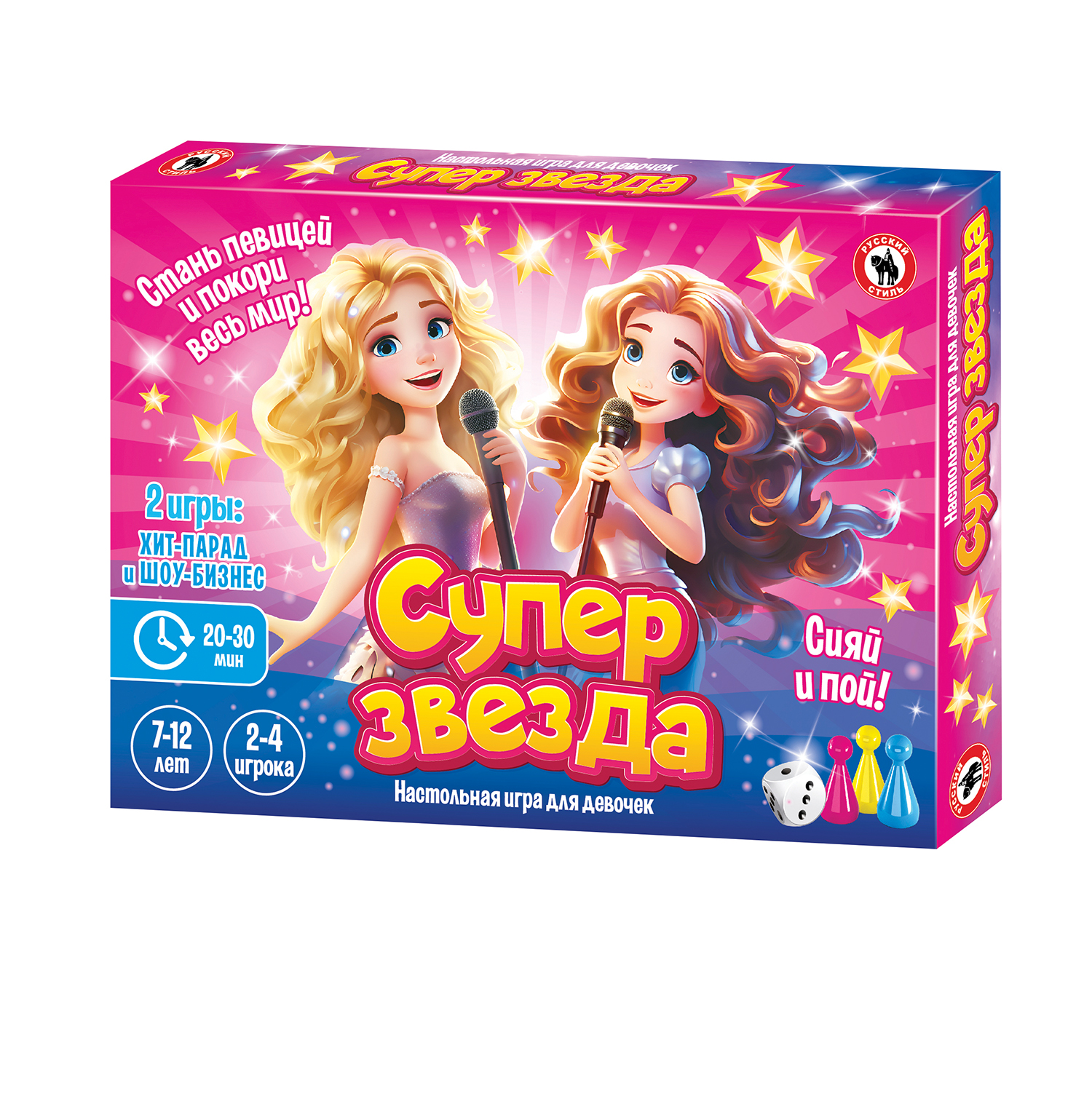 Мечтаешь стать настоящей суперзвездой, летать по миру с концертами и быть кумиром миллионов? Тогда скорее отправляйся в кругосветное турне со своим новым альбомом. Эта увлекательная игра распахнёт перед игроками двери в сверкающий мир шоу-бизнеса и вознесет на вершину успеха и популярности. Игрокам предстоит выпускать новые вокальные альбомы, давать концерты в разных уголках земного шара, сотрудничать с продюсером и побороться за самый высокий рейтинг, выпустив платиновый альбом. Количество игроков: 2-4 Возраст: 7-12 лет Состав игры: игровое поле, кубик, фишки – 4 шт., жетоны – 32 шт., карточки – 35 шт., правила игры Материал: картон, бумага, пластмасса