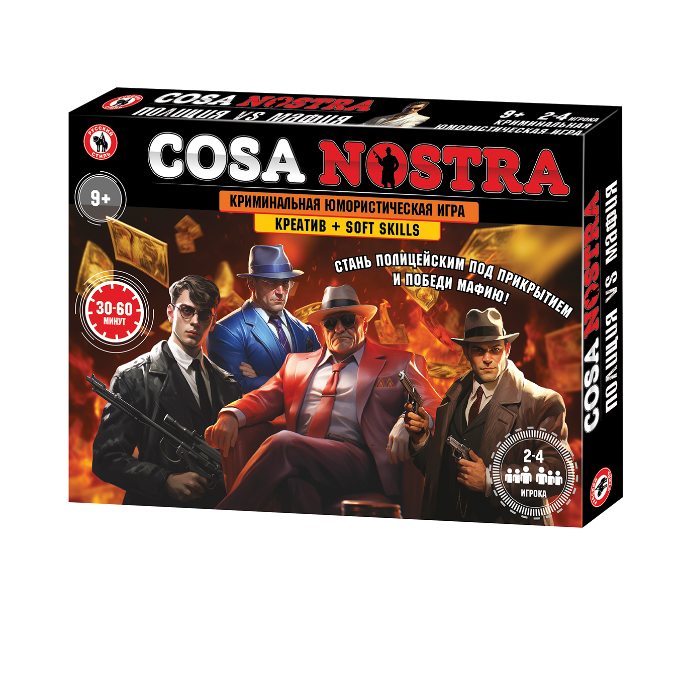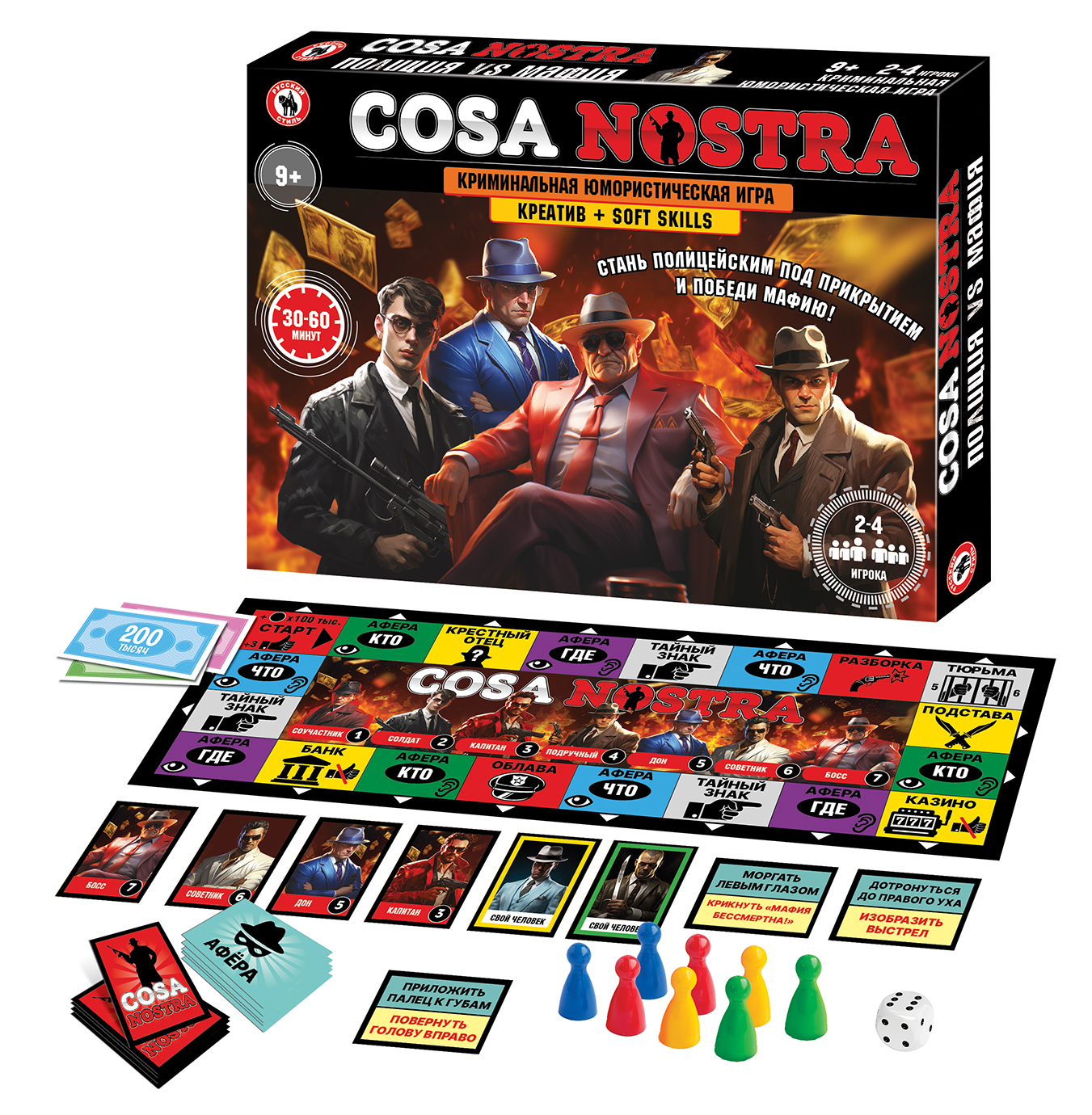 Мафия бессмертна, но и полиция не дремлет! Игрокам предстоит внедрить своих людей в сицилийскую мафию и разоблачить ее коварные планы! Игроки получают карточки с персонажами мафии, в ходе игры им предстоит встречаться с настоящей мафией, участвовать в аферах, изображать действия с помощью пантомимы: кто, где и как совершил аферу. В игре присутствуют карточки с тайными знаками, игрокам предстоит их изучить и незаметно давать друг другу тайные сигналы. Участвуя в этой увлекательной коммуникативной игре, дети и взрослые смогут продемонстрировать артистизм, смекалку и умение импровизировать. Количество игроков: 2-4 Возраст: 9+ Состав игры: игровое поле, кубик, фишки – 8 шт., карточки – 100 шт., жетоны – 40 шт., деньги – 40 купюр, правила игры. Материал: картон, бумага, пластмасса