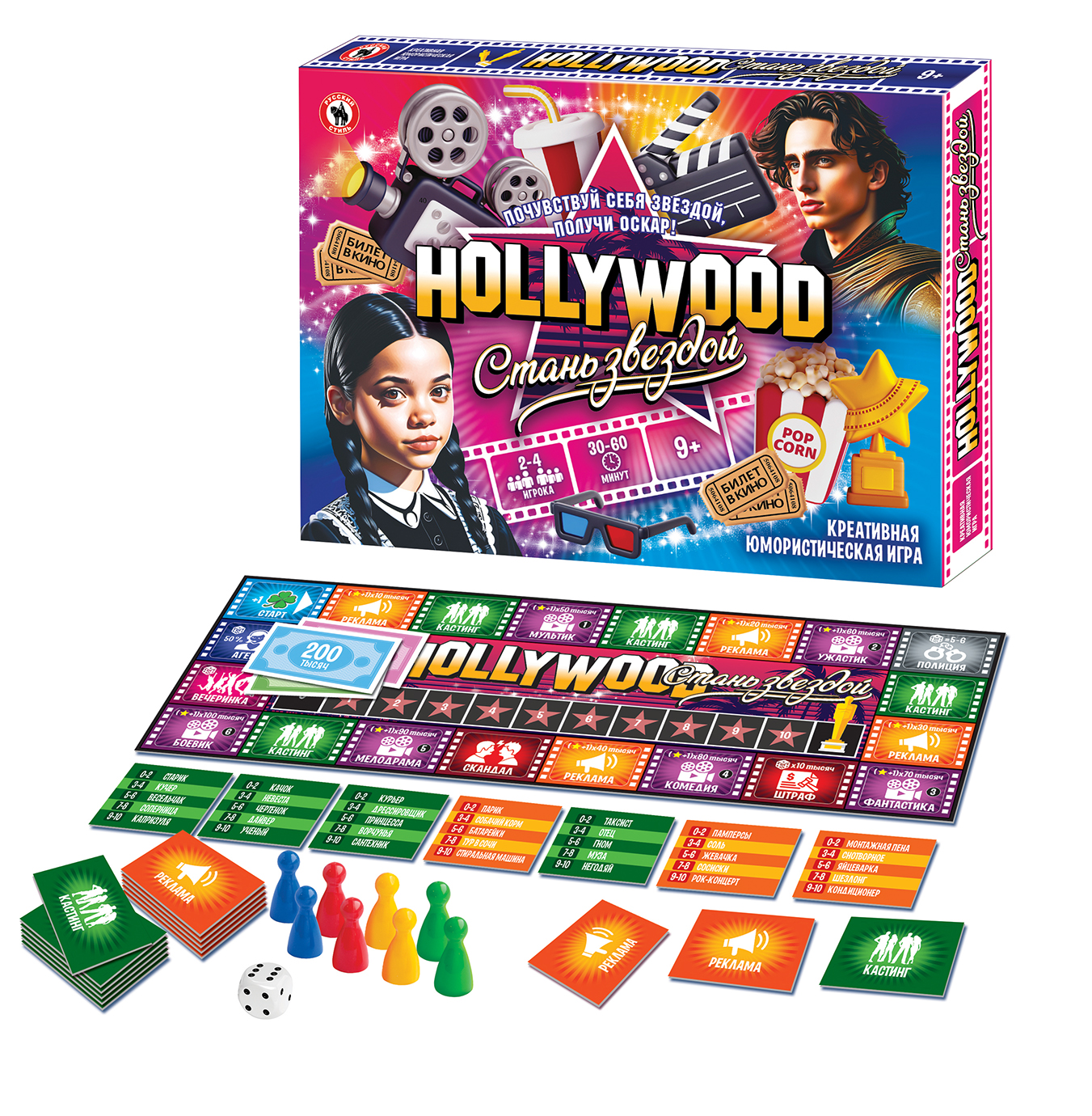 В этой увлекательной коммуникативной игре игрокам предстоит отправиться в Голливуд, где они будут участвовать в кастингах, кинопробах, сниматься в рекламе и кинофильмах. Игроки смогут развить свой актерский талант, завоевать славу и популярность, а также стать самой знаменитой и высокооплачиваемой кинозвездой, получив «Оскар»! Участвуя в этой увлекательной игре, дети и взрослые смогут продемонстрировать артистизм и умение импровизировать. Игроки получают карточки с заданиями, успешно выполняя их, продвигают свою фишку по клеткам на пути к Оскару. Количество игроков: 2-4 Возраст: 9+ Состав игры: игровое поле, кубик, фишки – 8 шт., карточки рекламы – 50 шт., карточки кинопроб – 50 шт., жетоны удачи – 40 шт., деньги – 40 купюр, правила игры. Материал: картон, бумага, пластмасса