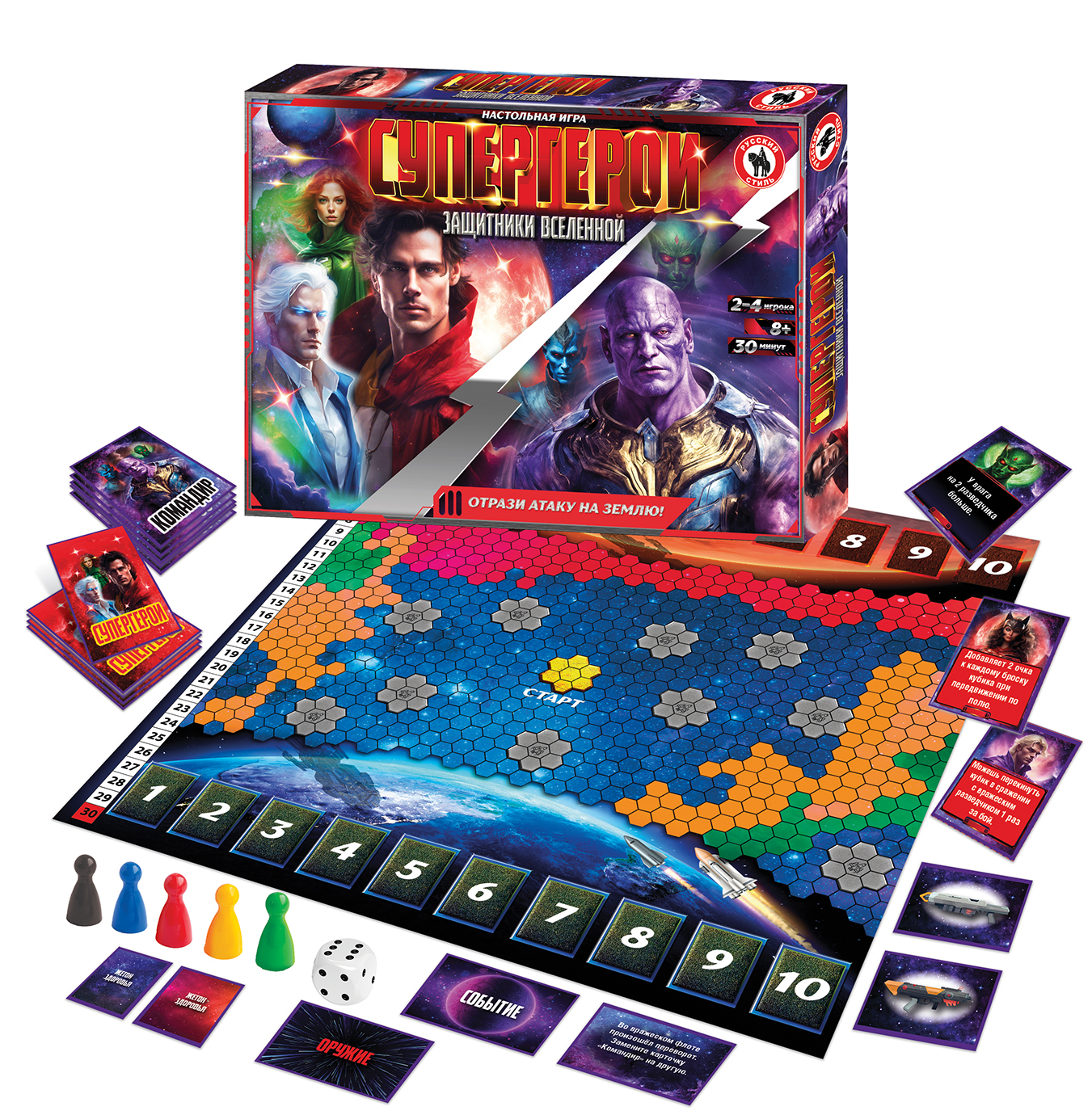 Галактика в опасности! Вражеский флот стоит у самой Земли. Супергероям нужно объединиться, чтобы защитить родную планету и спасти мир. В настольной игре «Супергерои. Защитники вселенной» игрокам предстоит уничтожать вражеских разведчиков, отражать атаки на Землю и собирать уникальное оружие, которое не позволит враждебной расе захватить планету. Это командная игра, в которой победа зависит от действий каждого участника. Чтобы спасти галактику, игрокам предстоит продумать тактику боя и эффективно использовать суперспособности каждого из игроков-супергероев. Количество игроков: 2-4 Возраст: 8+ Состав игры: игровое поле, карточки – 50 шт., фишки – 5 шт., кубик, правила. Материал: картон, бумага, пластмасса