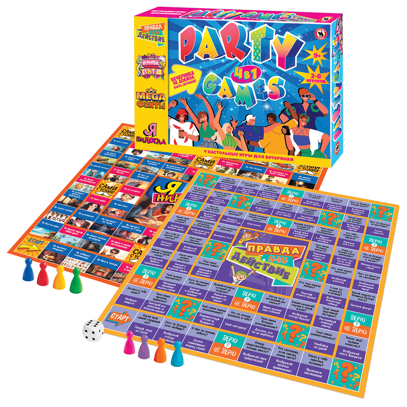 Игровой набор «Party games» включает четыре популярные настольные игры. Это самые популярные и веселые игры для вечеринки: вместе выполняйте смешные задания в «Мега фанты» и «Челлендж-пати», делитесь своими секретами в «Я никогда» или делайте всё это вместе, играя в «Правда или действие». Правила игры просты: игроки кидают кубик, передвигают фишки, отвечают на вопросы или выполняют действие на клетке поля. Игры помогут игрокам узнать друг друга поближе, крепче подружиться и повеселиться. Вечеринка в кругу друзей будет незабываемой! Играть можно как вдвоём, так и большой компанией до 8 человек. Количество игроков: 2-8 Возраст: 9+ Состав игры: поле – 2 шт., фишки – 8 шт., кубик – 1 шт., правила игры. Материал: бумага, картон, пластмасса