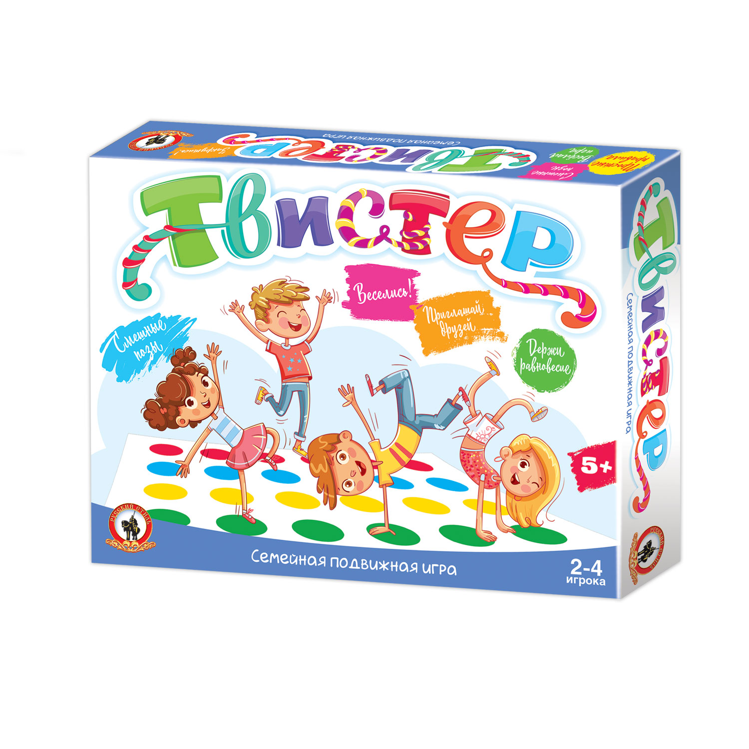 Твистер — это подвижная напольная игра; которая подойдёт не только для двух игроков; но и для большой компании! Играть в неё очень просто даже самым маленьким игрокам; нужно просто выполнять задания ведущего и не падать на игровом поле. Ведущий крутит стрелку по очереди для каждого игрока. Стрелка указывает какую руку или ногу игрок должен переставить и на какой цветовой круг. Тот; кто не смог удержать равновесие – выбывает из игры. Выигрывает тот; кто оказался самым устойчивым и не упал. Чем больше участников; тем игра становится азартнее и веселее! Всё; что понадобится для игры – это немного места для напольного коврика и 5-20 минут на партию. Количество игроков для игры в Твистер: от 2 до 4.